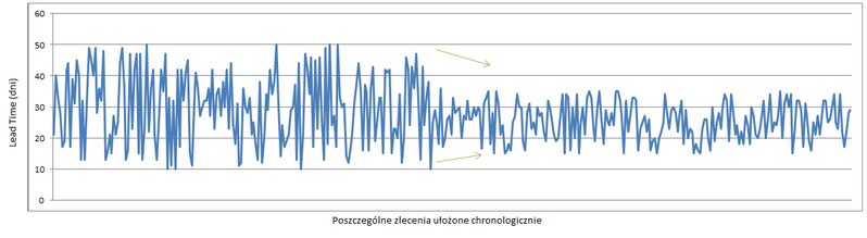 Poprzez wdrożenie zasady FIFO (First In First Out – Pierwsze weszło, pierwsze wyszło) w zapasach międzyoperacyjnych. Dzięki tej zasadzie czas przejścia przez proces się wyrównuje, a my możemy go precyzyjniej określić. Zdecydowanie ułatwia to planowanie zakupów surowców i samej produkcji oraz pozwala pracować w systemie Just-in-Time. Wykres poniżej przedstawia jak wyrównuje się Lead Time dzięki temu rozwiązaniu.