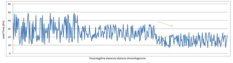 To wszystko prowadzi do zmniejszenia ilości zapasów międzyoperacyjnych, a tym samym odmrożenia kapitału oraz zmniejszenia Lead Time. Wykres poniżej przedstawia reakcję czasu przejścia przez produkcję po ograniczeniu zapasów.