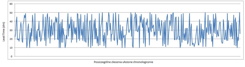 Skutkuje to tym, że niektóre zlecenia mogą „siedzieć” na produkcji zdecydowanie dłużej niż powinny. Zdecydowanie wpływa to na Lead Time (czas przejścia) i zarazem na zwrot gotówki (Cash Flow). Dodatkowo utrudnia to pracę planistom, którzy na bieżąco musza korygować opóźnienia, aby nie zaniżyć dostaw na czas. Zakupy również mają problem z określeniem daty zakupu surowców na dane zlecenia, co powoduje opóźnienia. Tabela poniżej przedstawia wahania czasu przejścia w takiej sytuacji.