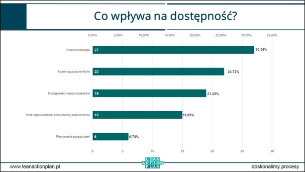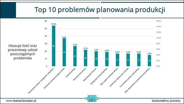 Na podium znalazły się również awarie i przestoje, znaczenie których podkreśliło 7% uczestników. W dalszej kolejności wymieniano również absencje pracowników, która jest szczególnie dokuczliwa dla blisko 6%. Dużym problemem okazał się również brak bieżących danych – zmaga się z nim ponad 5%, podobnie jak z niewystarczającą dostępnością maszyn i zasobów. Niemal 4,5% opowiedziały się za brakiem systemu zbierania danych. Taka sama ilość osób wyróżniła: zmienność zakresu prac oraz zakłócenia komunikacji między pracownikami. Ostatnią przeszkodą w top 10, są niewystarczające kompetencje pracowników, którą zauważyło blisko 4%.
