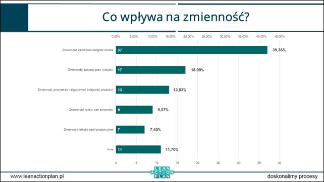 Wśród odpowiedzi wyróżniliśmy 5 kluczowych przyczyn. Prawie 40% odpowiedzi dotyczących zmienności to zmienność zamówień i prognoz klienta. Jeden z ankietowanych napisał: