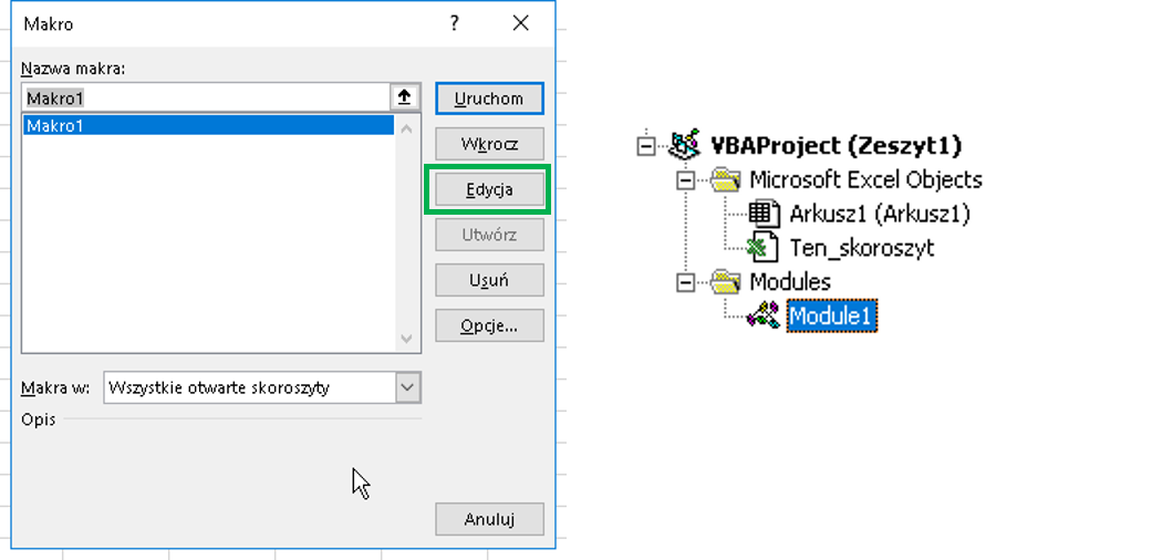 - Jeżeli używasz polecenia Makra, wybierz z listy wpis o nazwie Makro 1,2 ,3 etc. (numery zależą od tego ile razy nagrywałeś makro w danym pliku), a następnie użyj opcji