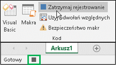 Ikona polecenia zamieni się na niebieski przycisk stop. O tym, że rejestrator makr jest aktywny informuje Cię również ikona w lewym dolnym rogiem pod paskiem z arkuszami.