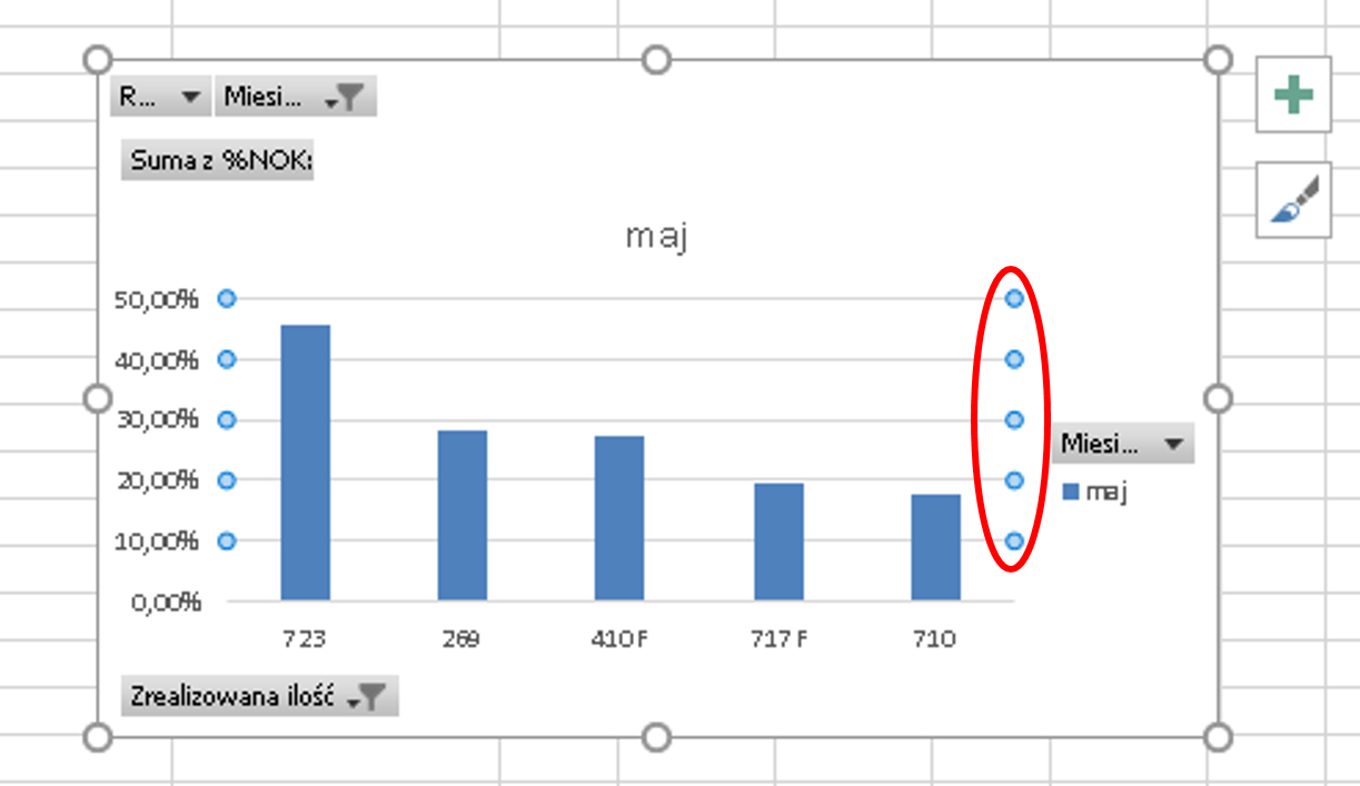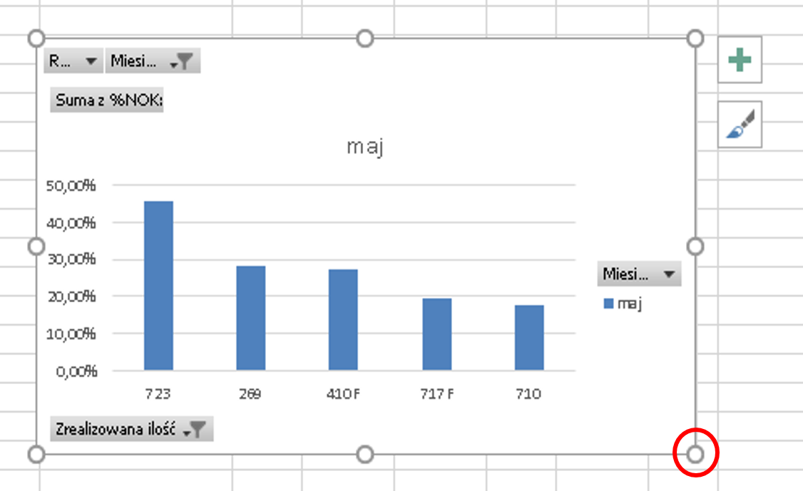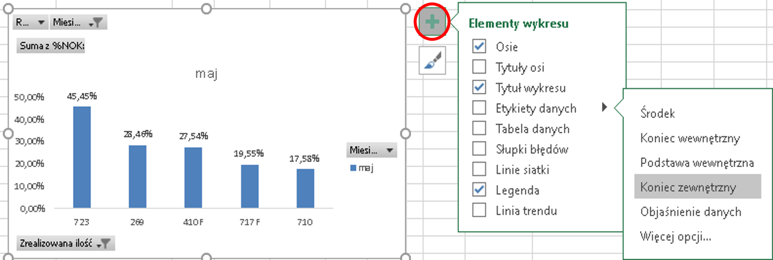 Celem stworzonego wykresu jest pokazywanie 5 wyrobów z największą ilością braków w danym miesiącu. Do osiągnięcia zamierzonego efektu potrzebuje my jeszcze Sortowania i odpowiedniego filtrowania danych.