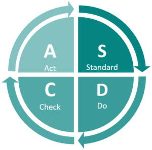Działaj – Jeżeli plan się sprawdził należy działać według wprowadzonych w nim usprawnień, a wszelkie procedury należy zestandaryzować, aby poprzedni stan nie wrócił. Jeżeli zakładane rezultaty nie zostały osiągnięte – rozpocznij cały cykl od nowa. Zweryfikuj plan, założone cele i sposób działania, a także wprowadź do niego niezbędne poprawki. Przetestuj hipotezę i porównaj wyniki. Jeżeli okaże się, że założenia zostały spełnione, należy zadziałać w kierunku utrzymania opracowanego rozwiązania. Aby zadbać o powtarzalność procesu, należy opracować standardy do praktyk będących wynikiem cyklu.