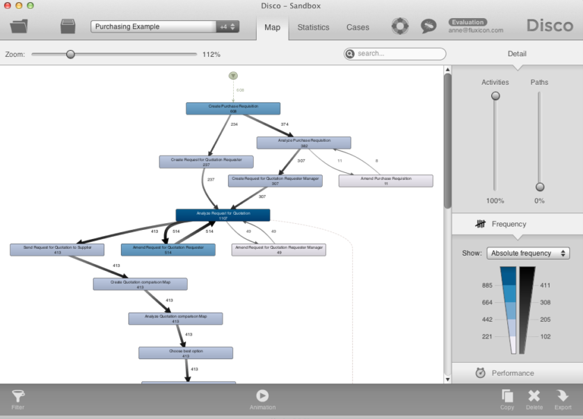 Jednym z takich narzędzi jest prezentowane na zdjęciu DISCO (strona producenta), w którym można stworzyć diagram procesu i analizować go pod kątem: przepływów, czasów, obciążeń, wąskich gardeł oraz występujących w nim anomalii oraz ich częstotliwości. Prawdziwe narzędzie managera 4.0.