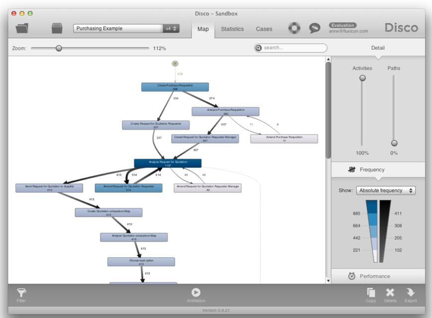 Jednym z takich narzędzi jest prezentowane na zdjęciu DISCO (strona producenta), w którym można stworzyć diagram procesu i analizować go pod kątem: przepływów, czasów, obciążeń, wąskich gardeł oraz występujących w nim anomalii oraz ich częstotliwości. Prawdziwe narzędzie managera 4.0.