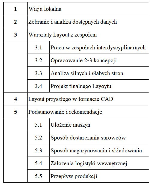 Celem warsztatów jest ułożenie optymalnego i efektywnego ułożenia stanowisk pracy i maszyn. Warsztaty oparte są na naszej metodzie 3P – Proces Przygotowania Produkcji z uwzględniam naszego doświadczenia w firmach MŚP i dużych korporacjach.