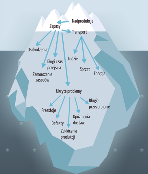 To jedna z najgorszych strat, gdyż pociąga za sobą kolejne. Wyprodukowanie więcej, niż zamówił klient (praca z niższym czasem taktu, niż takt klienta) wiąże się z dodatkowym zużyciem surowców, wykorzystaniem siły roboczej, transportu, magazynowania oraz zbędnych ruchów. Nadprodukcja często wizualizowana jest za pomocą góry lodowej – zazwyczaj na hali widać nadprodukcję, bo maszyny pracują pełną parą, widać również zapasy, które zalegają na hali i w magazynach, i widać trochę transportu – wszyscy gdzieś się przemieszczają. Ale w jakim celu? Poniżej dostrzec można ukryte problemy, których zazwyczaj nie widać na pierwszy rzut oka. Są to uszkodzenia zapasów, zamrożone zasoby, przestoje, defekty, zakłócenia, opóźnienia dostaw i inne.