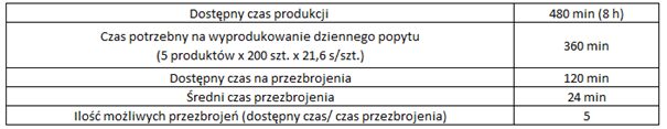 Stwierdzono, że warto policzyć ile dziennie można wykonać przezbrojeń. W tym celu oszacowano ile jest dziennie dostępnego czasu na przezbrojenie, a następnie podzielono przez czas trwania średniego przezbrojenia. W wyniku uzyskano, że dziennie można wykonać 5 przezbrojeń czyli tyle ile jest produktów.