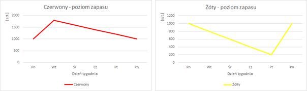 Niestety w tym celu konieczne jest utrzymywanie ciągłego zapasu na poziomie 5 000 szt. Na początku każdego tygodnia musi być dostępny każdy produkt i musi być zapewniony na poziomie czasu jego kolejnego uzupełnienia czyli 1 tydzień (popyt tygodniowy 1 000 szt.). Codziennie wysyłane jest 1 000 szt. i tyle samo produkowane, stąd codziennie w zapasach jest 5 000 szt.