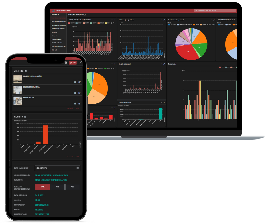 Rozwiązanie: Wprowadzono aplikację zbierającą dane dotyczące reklamacji, reklamacji do dostawców, problemów wewnętrznych, działań poaudytowych, działań długoterminowych, PPAP i Lessons learned. Aplikacja monitoruje aktualne braki jakościowe na produkcji oraz ich przyczyny.