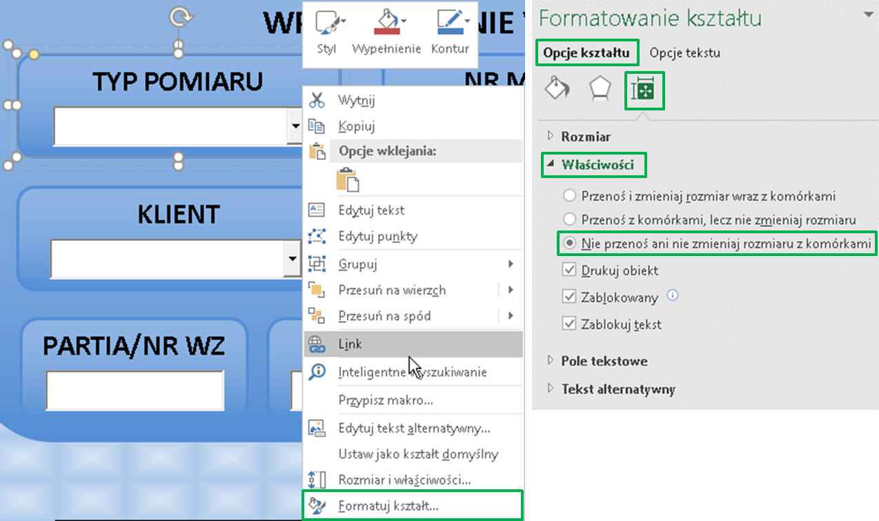 Użyj prawego przycisku myszy na jednym z obiektów i wybierz polecenie Formatuj kształt. Z panelu po prawej stronie wybrać kartę Opcje kształtu, następnie zakładkę Rozmiar i właściwości. Rozwiń grupę właściwości i wybierz opcję Nie przenoś ani nie zmieniaj rozmiaru z komórkami.