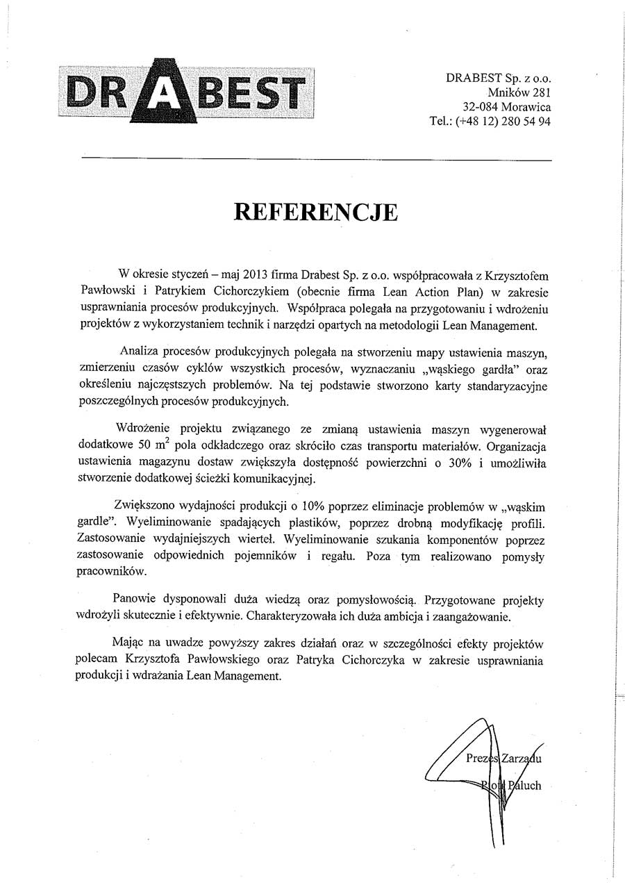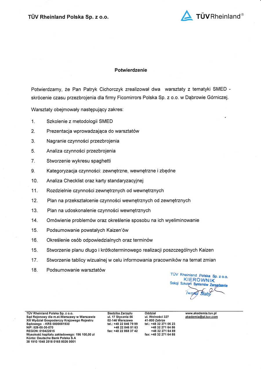 „Jako klient firmy Lean Action Plan jesteśmy zadowoleni ze współpracy z Panem Patrykiem Cichorczykiem. Wykazał się wysokim profesjonalizmem, umiejętnością pracy z ludźmi, zdolnościami analitycznymi oraz klarowanym sposobem przekazywania wiedzy.”