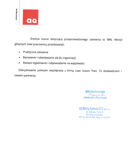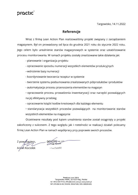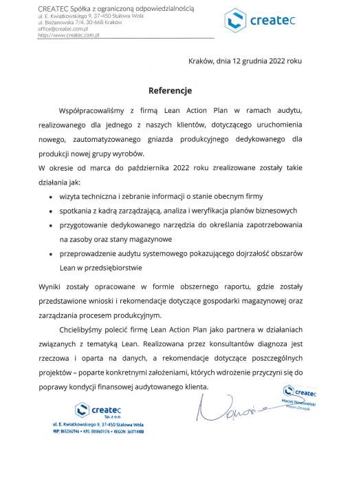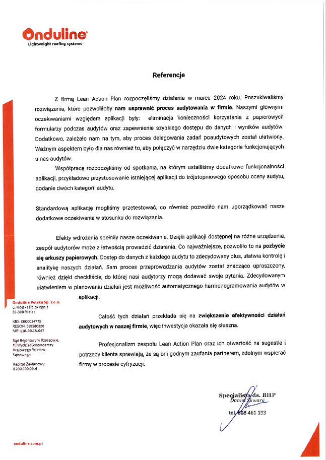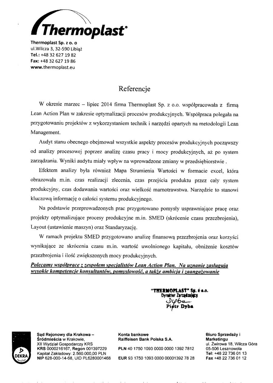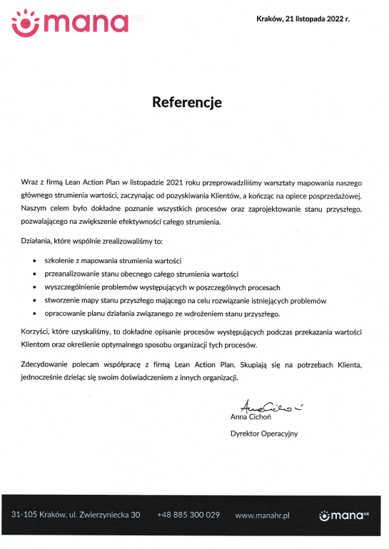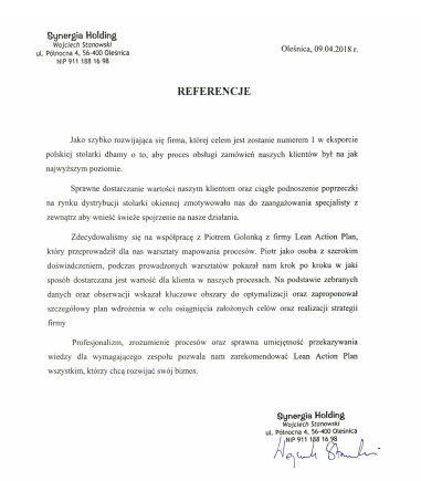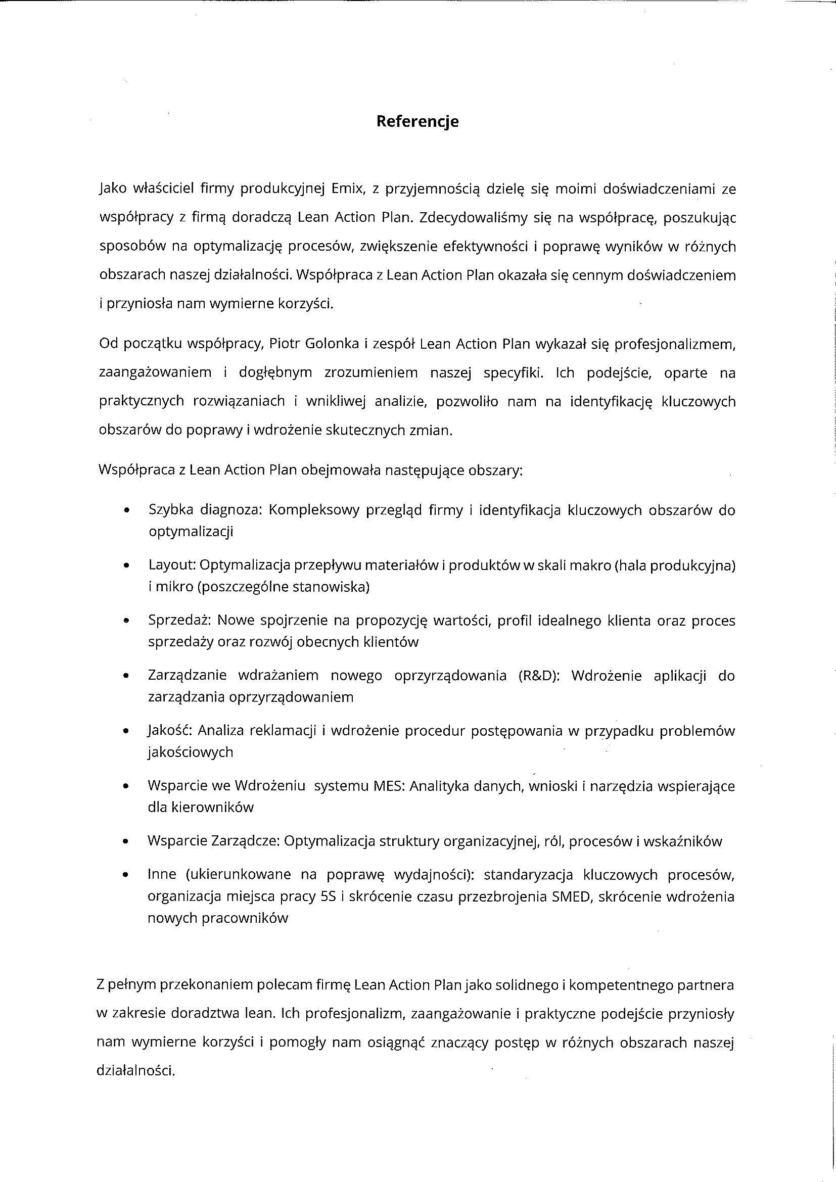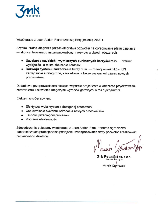 „Usługa została wykonana solidnie, a profesjonalne i elastyczne podejście firmy Lean Action Plan pozwoliło na realizację wszystkich etapów umowy w określonym terminie”.