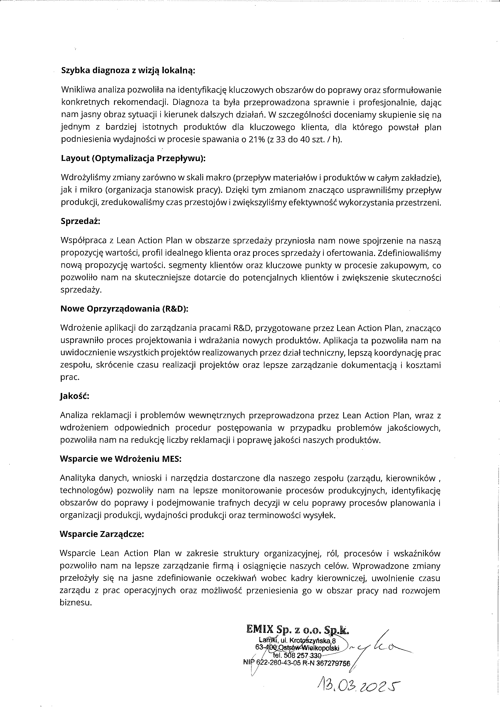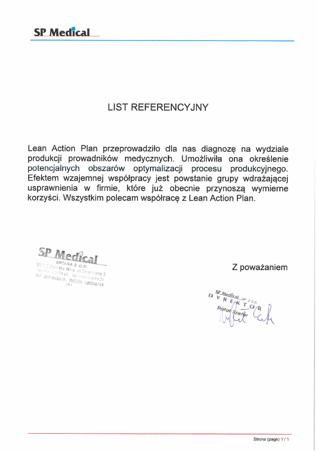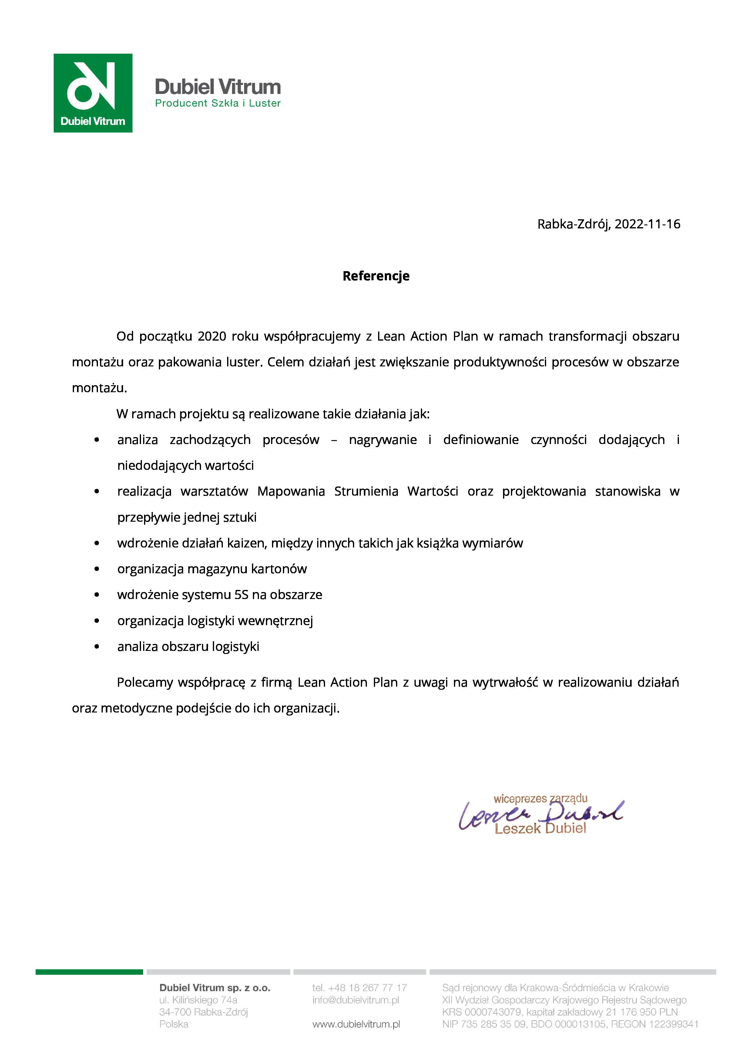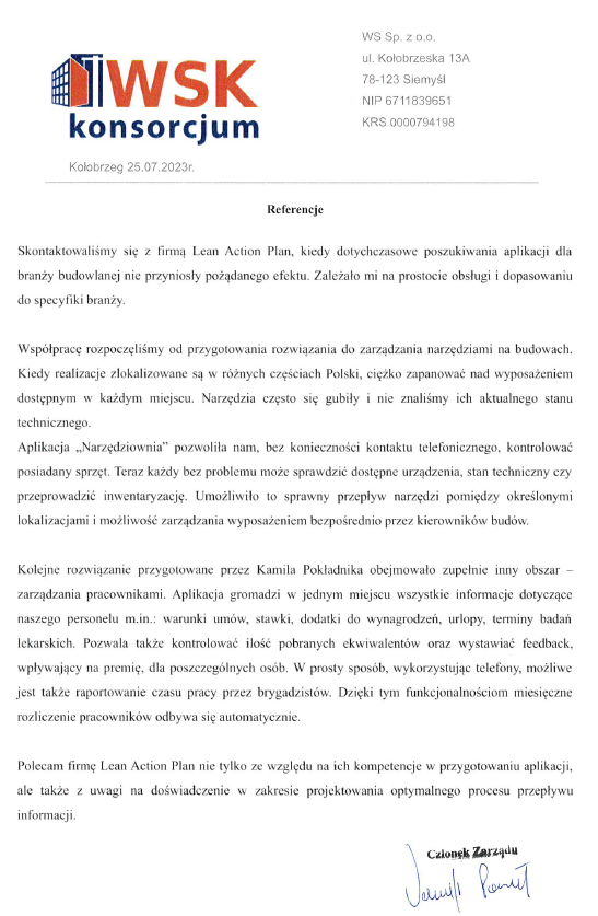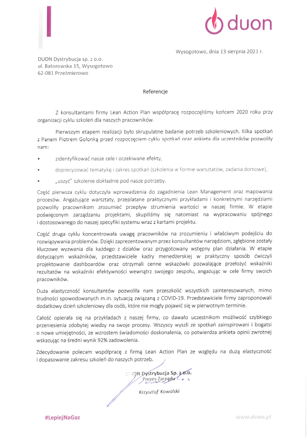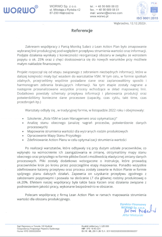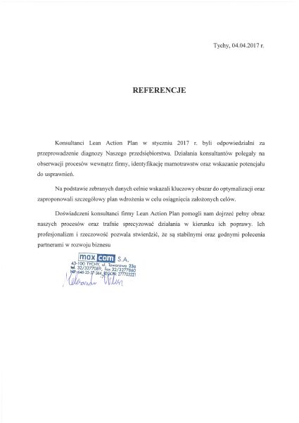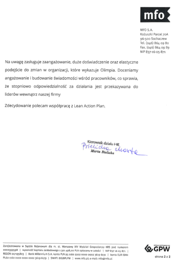 „Usługa została wykonana solidnie, a profesjonalne i elastyczne podejście firmy Lean Action Plan pozwoliło na realizację wszystkich etapów umowy w określonym terminie”.