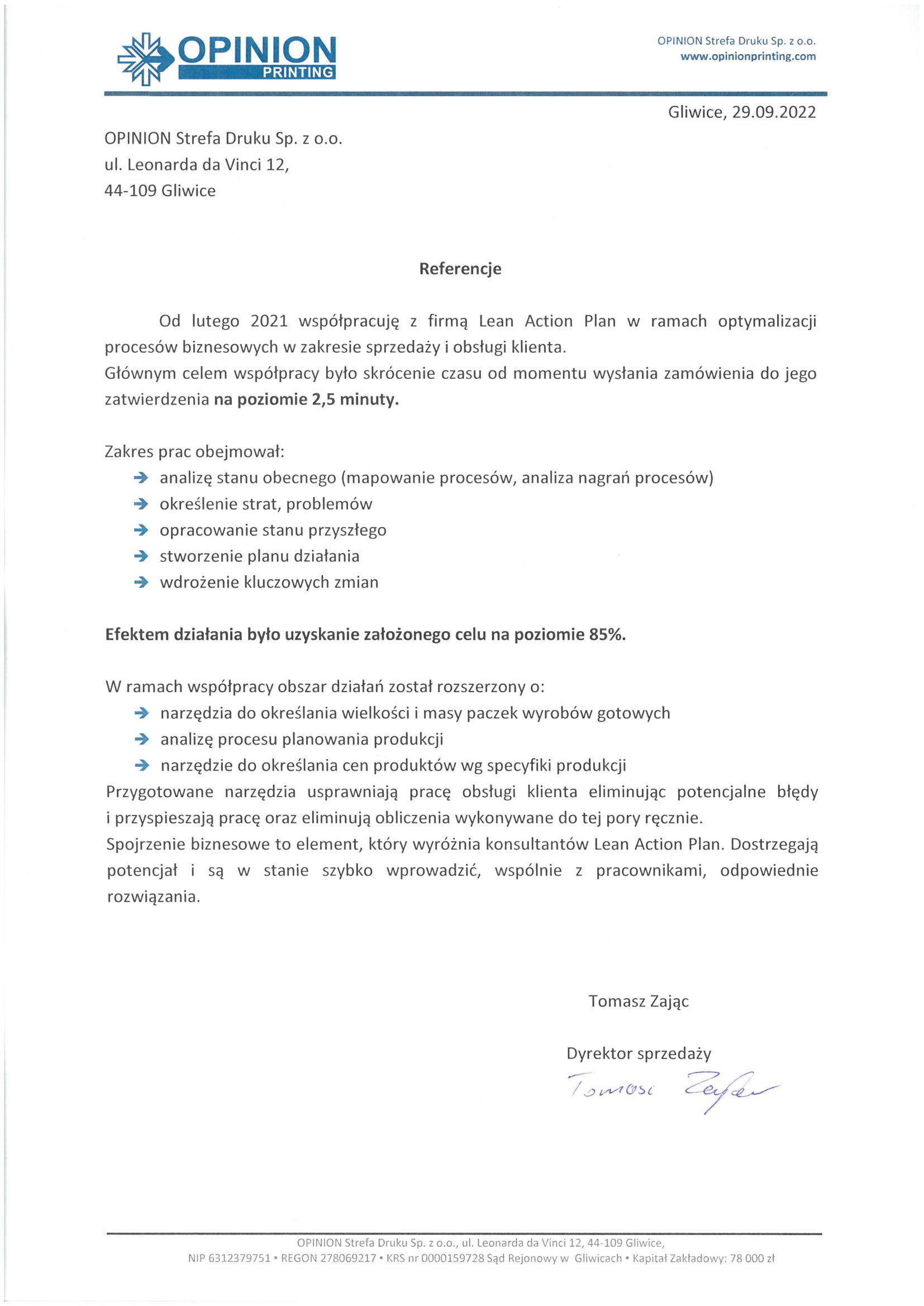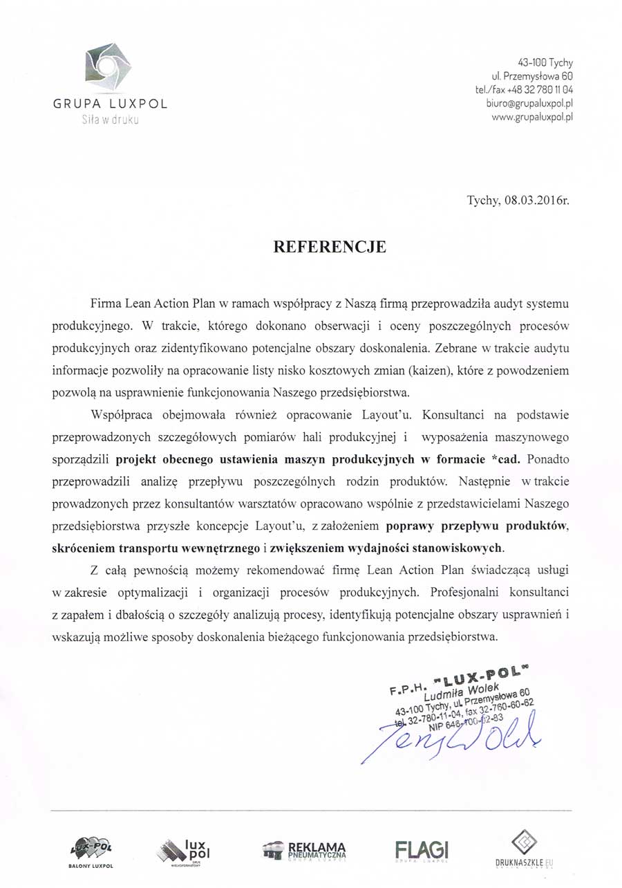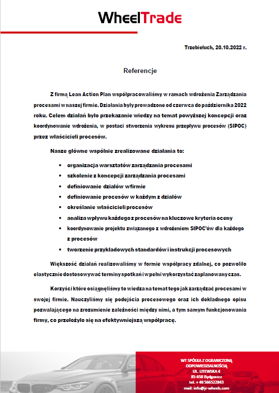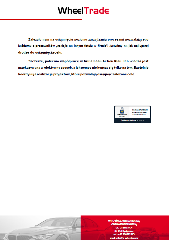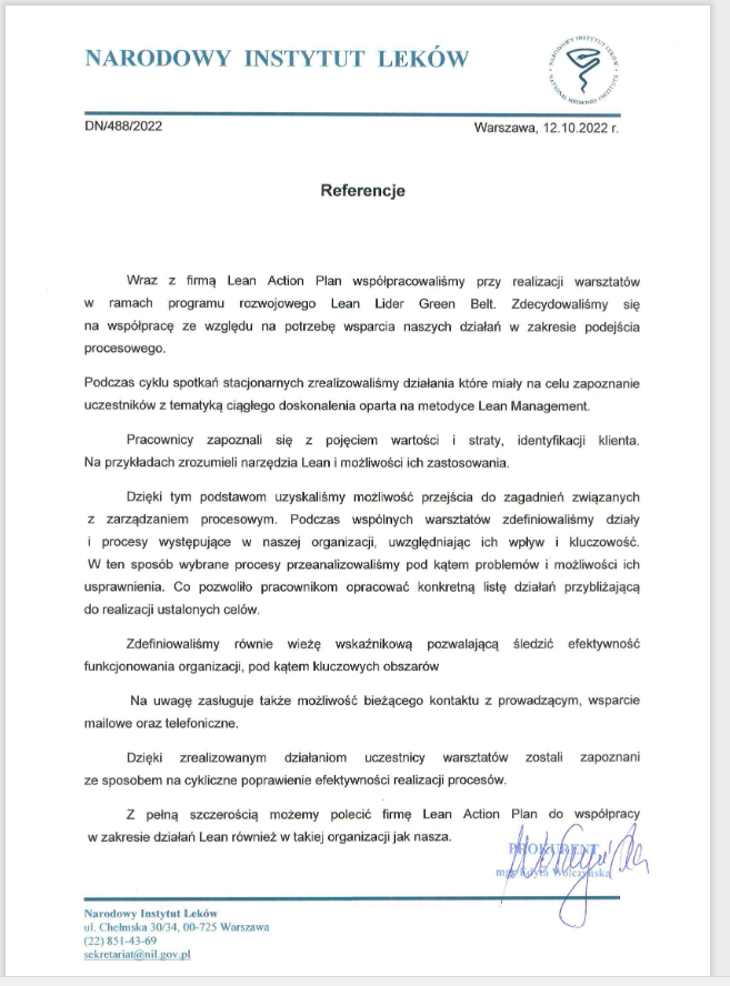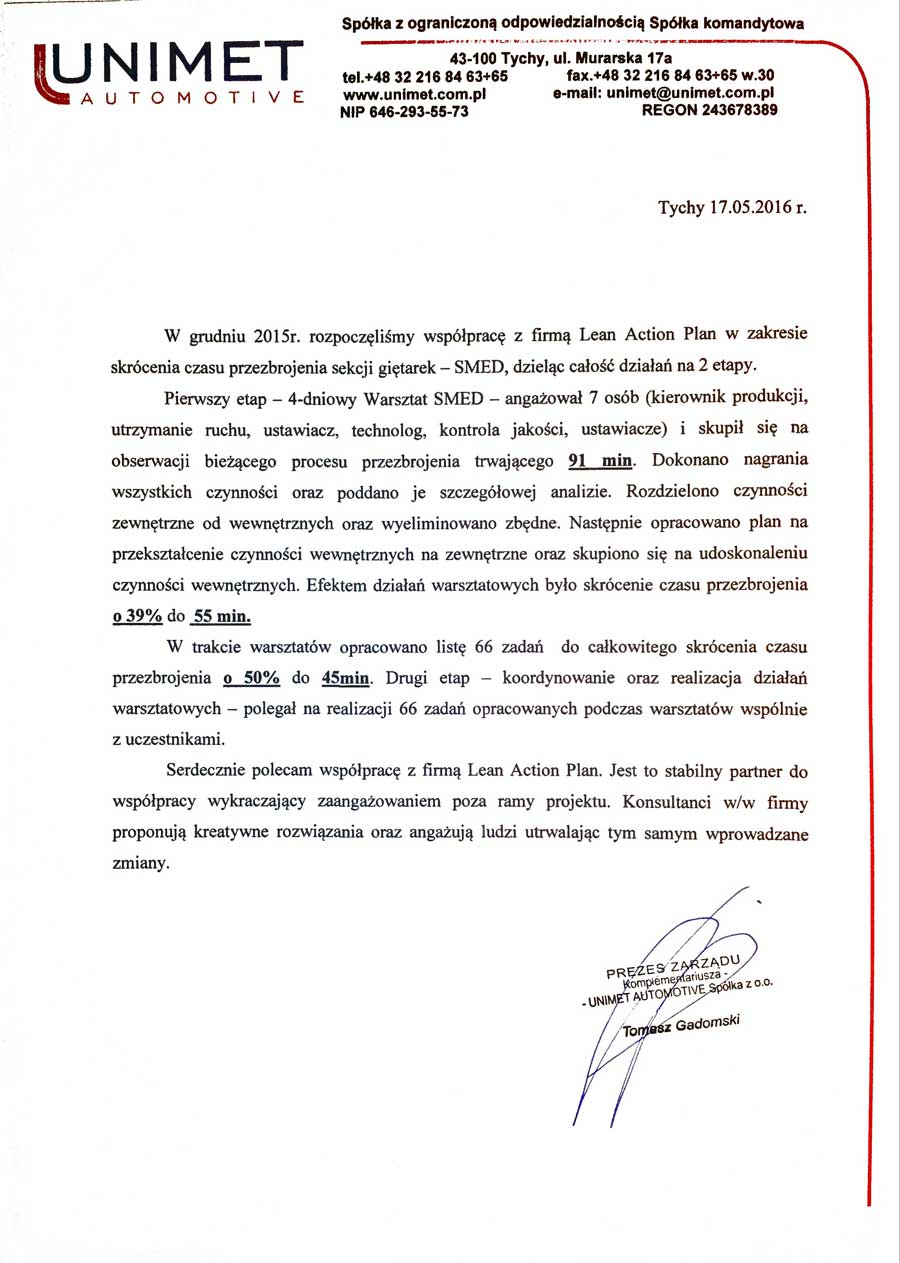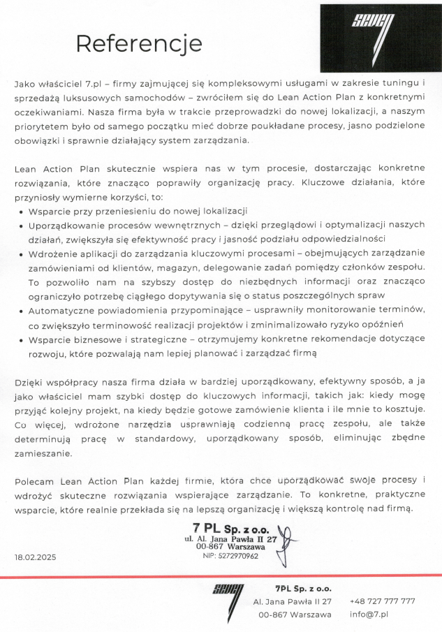 „Usługa została wykonana solidnie, a profesjonalne i elastyczne podejście firmy Lean Action Plan pozwoliło na realizację wszystkich etapów umowy w określonym terminie”.