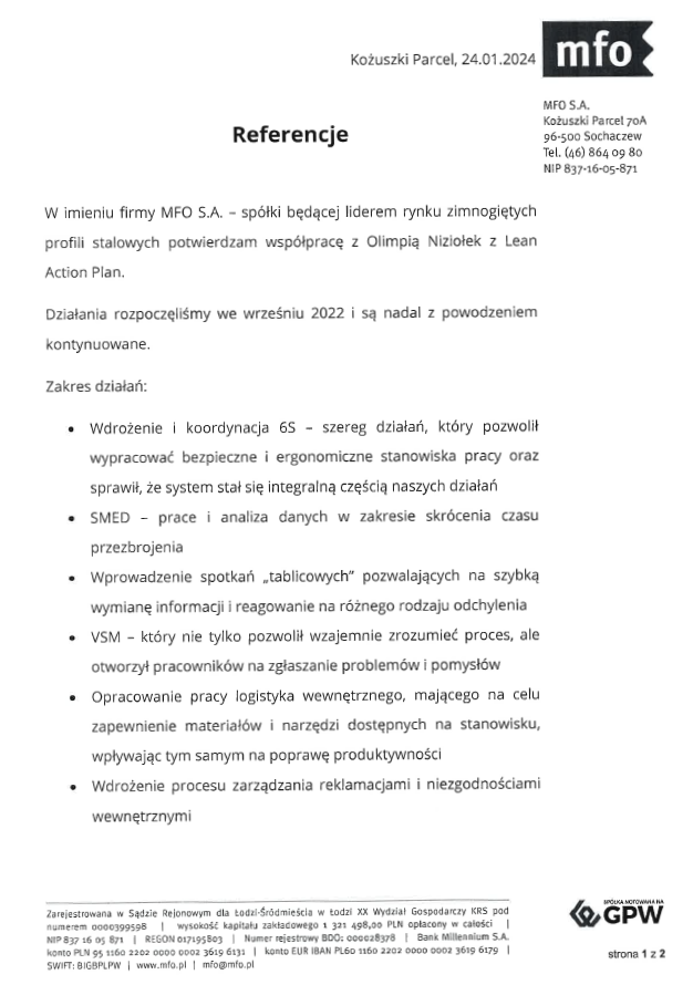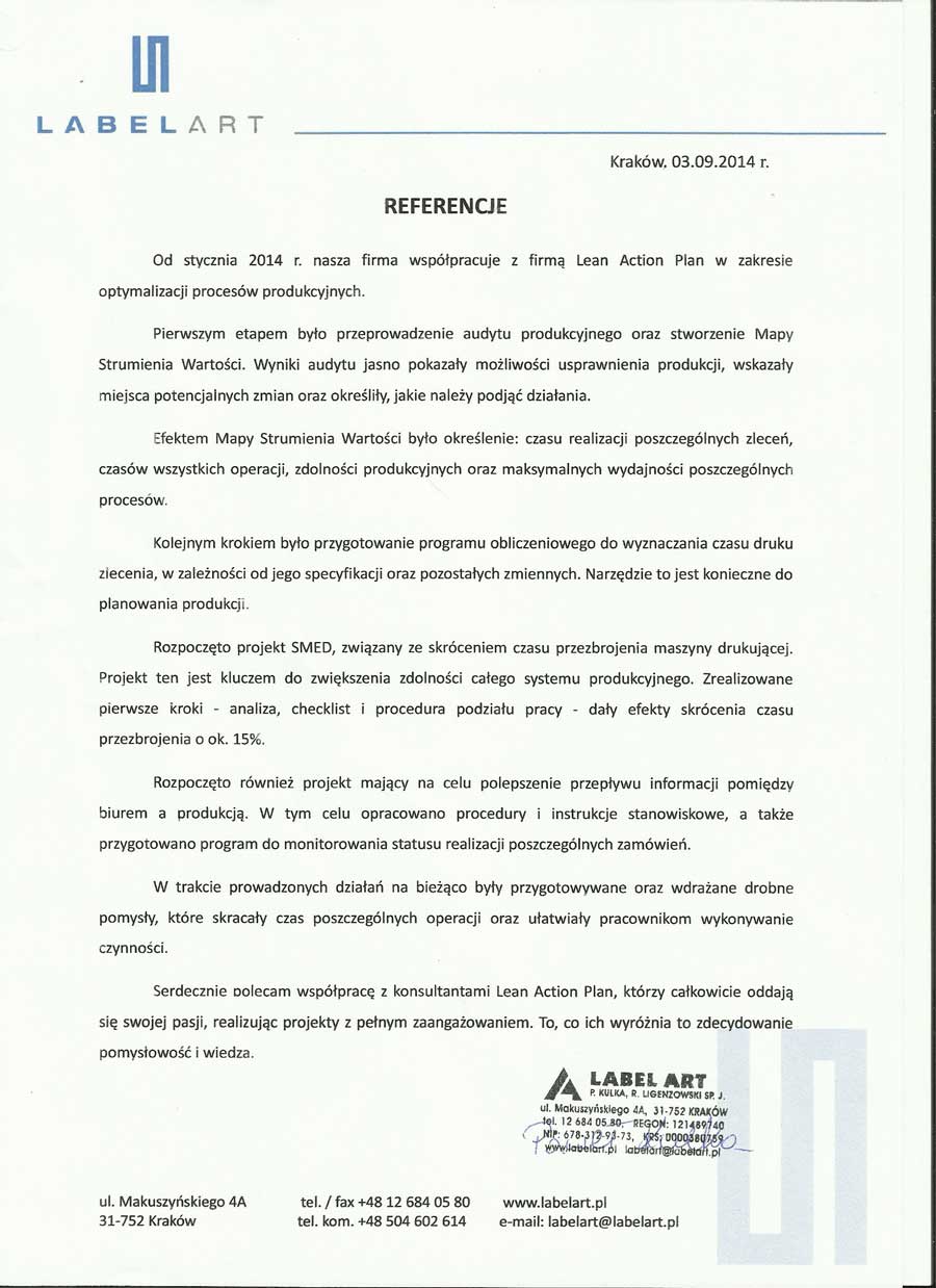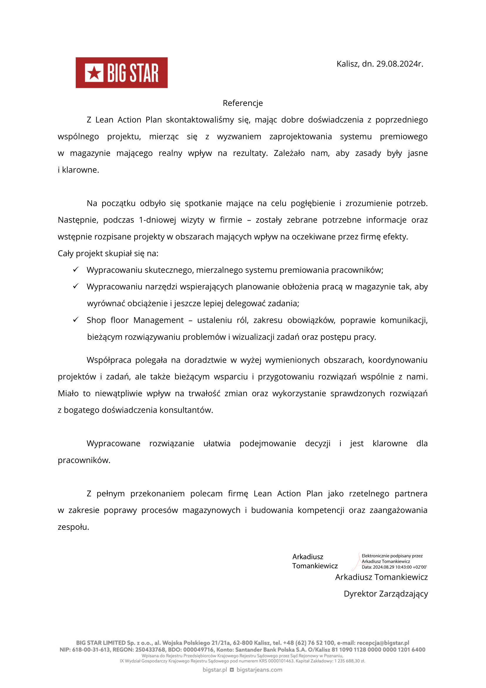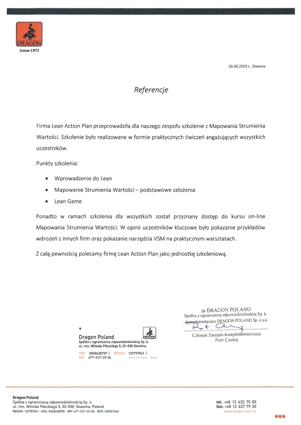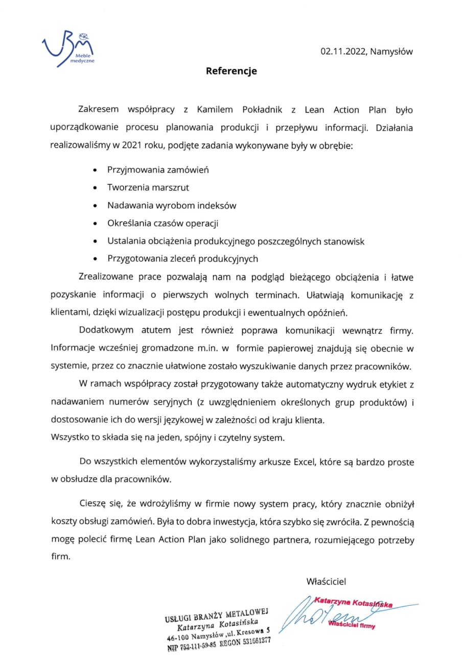 „Usługa została wykonana solidnie, a profesjonalne i elastyczne podejście firmy Lean Action Plan pozwoliło na realizację wszystkich etapów umowy w określonym terminie”.