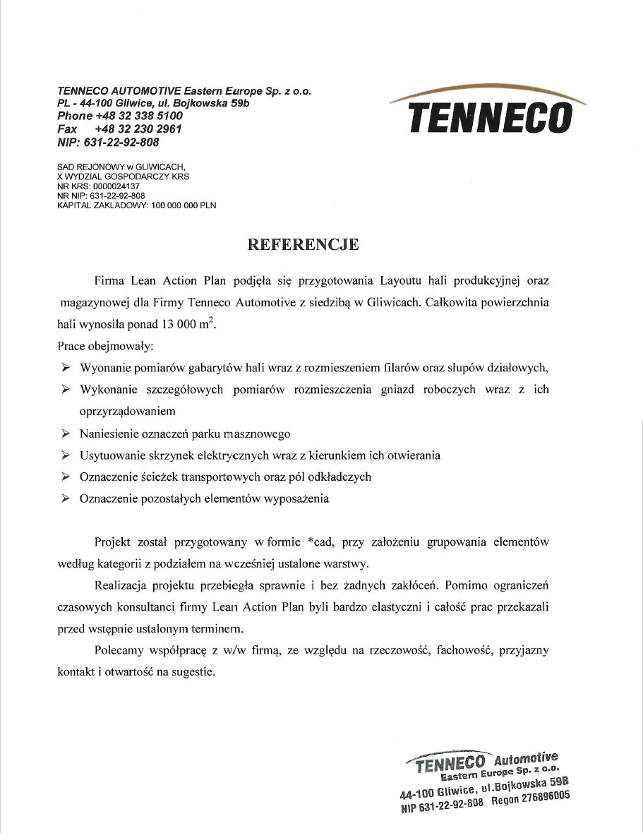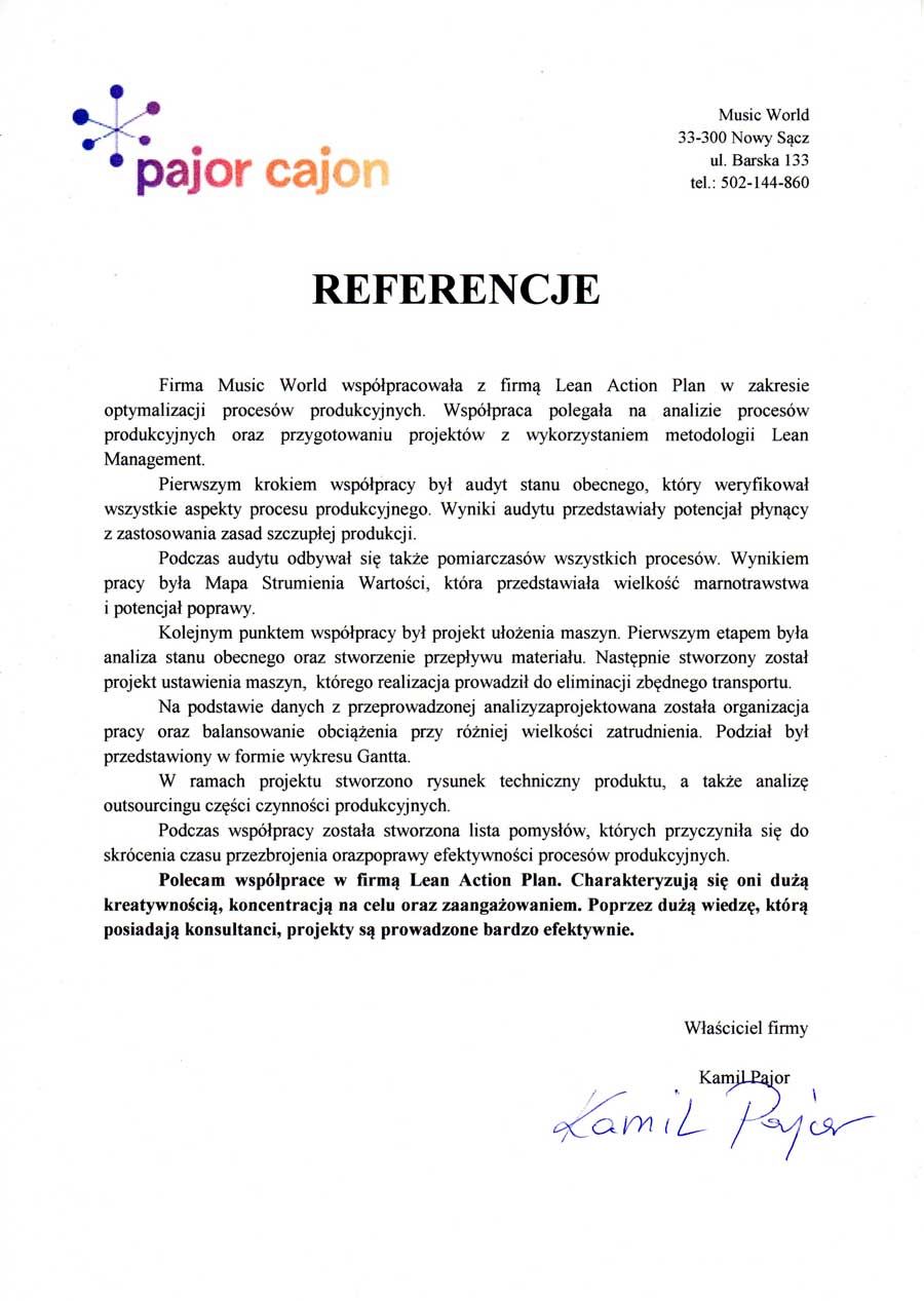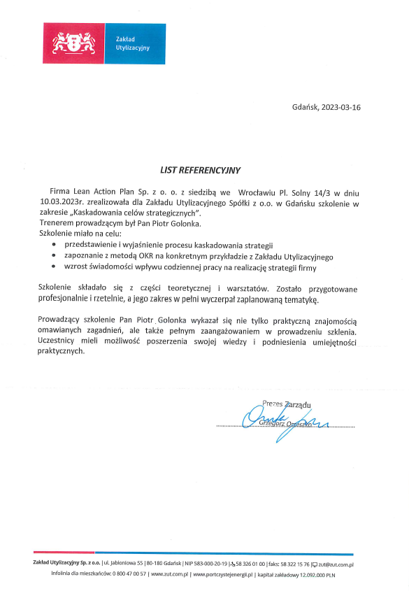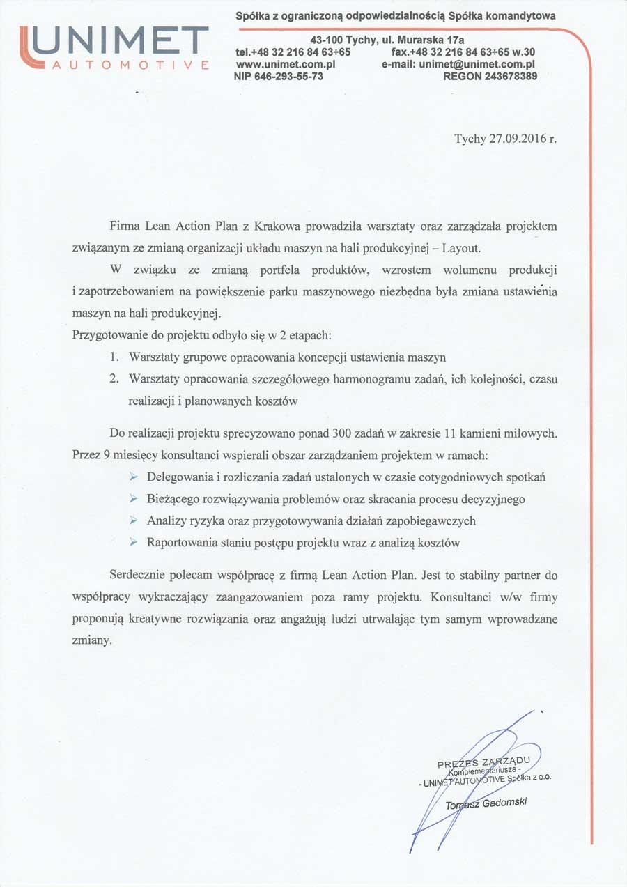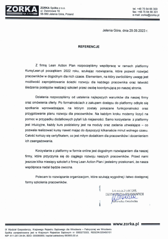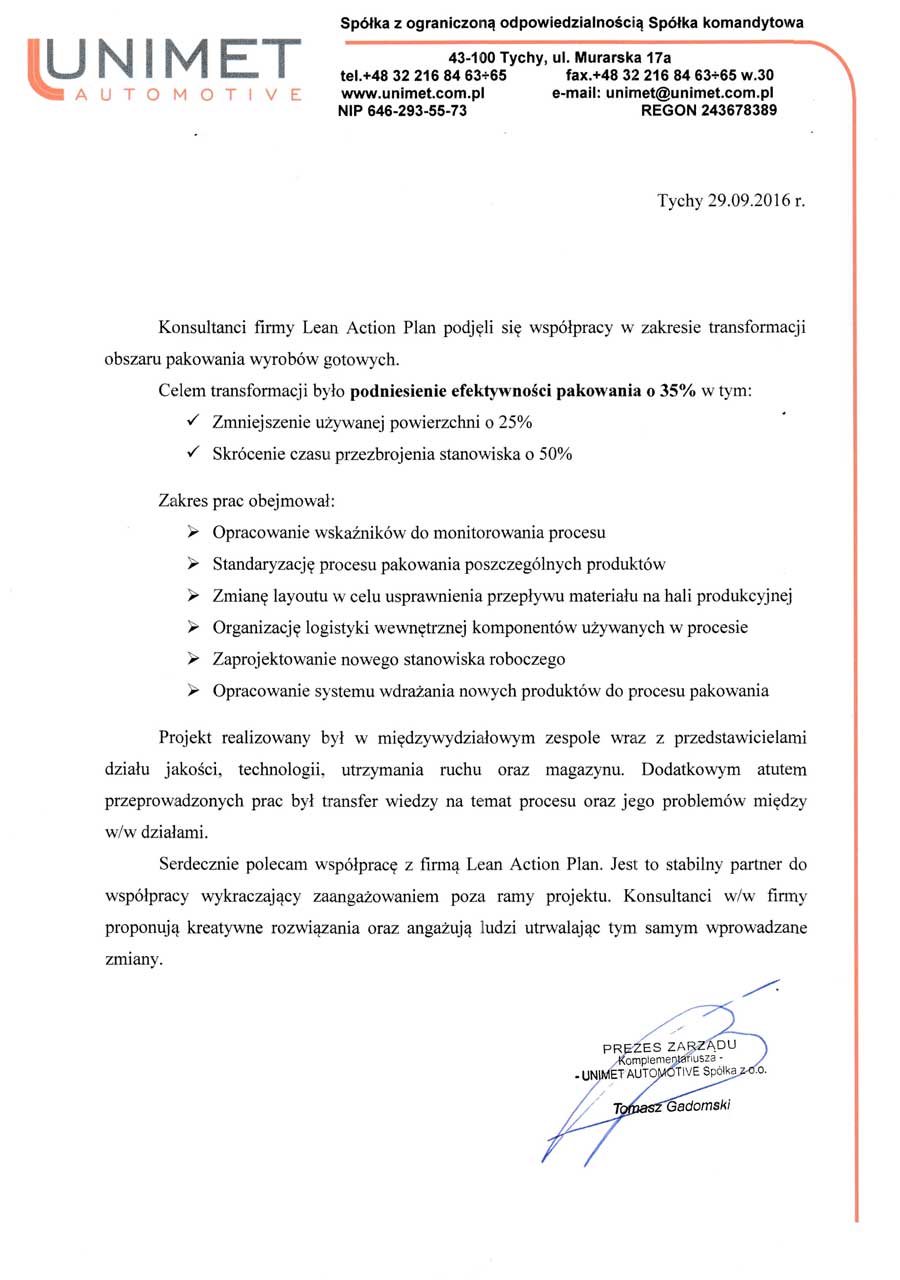 „Usługa została wykonana solidnie, a profesjonalne i elastyczne podejście firmy Lean Action Plan pozwoliło na realizację wszystkich etapów umowy w określonym terminie”.