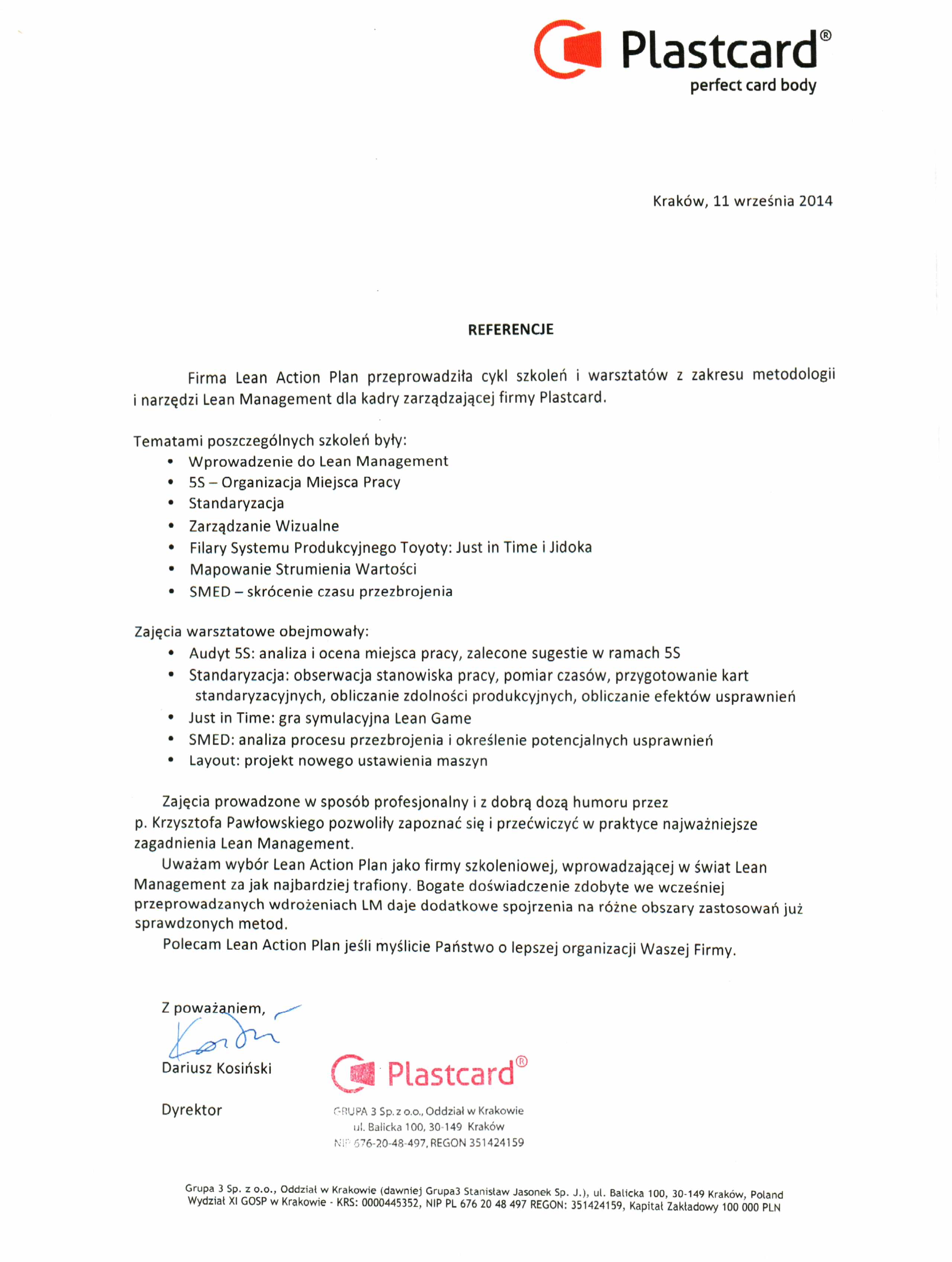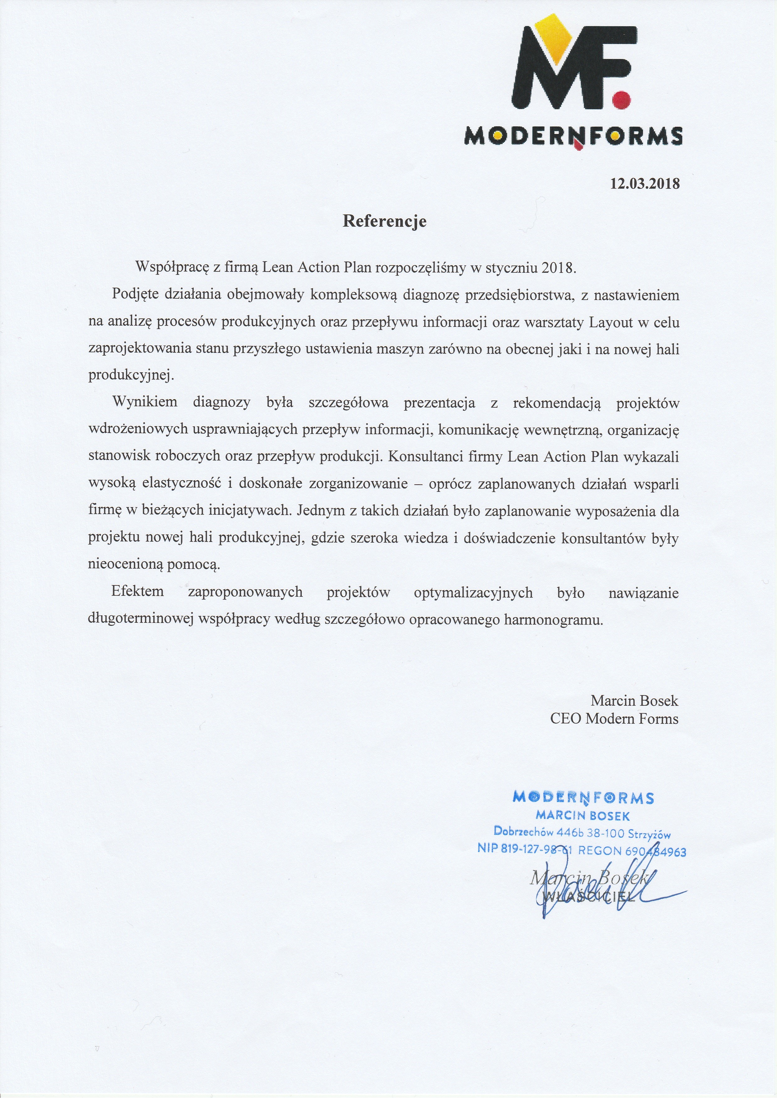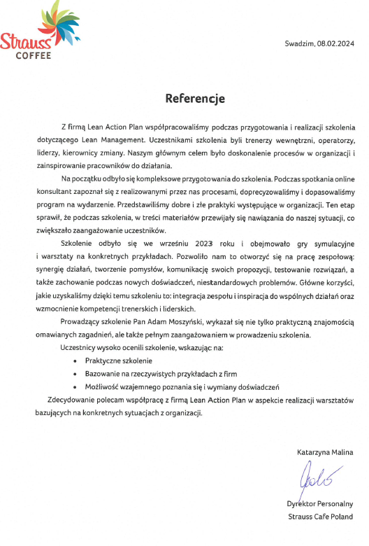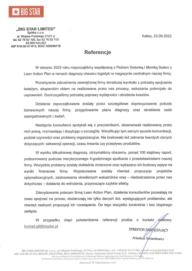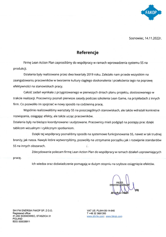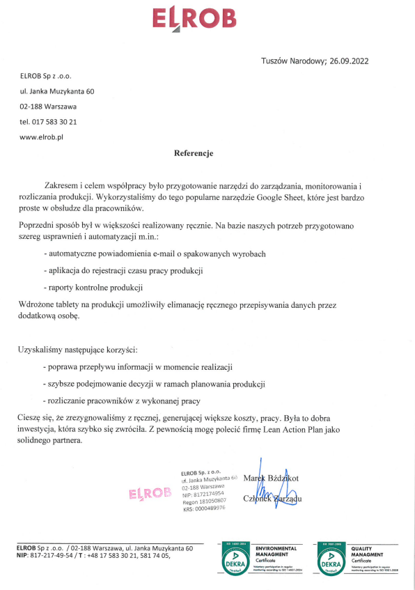 „Z całą pewnością możemy rekomendować firmę Lean Action Plan świadczącą usługi w zakresie optymalizacji i organizacji procesów produkcyjnych. Profesjonalni konsultanci z zapałem i dbałością o szczegóły analizują procesy, identyfikują potencjalne obszary usprawnień i wskazują możliwe sposoby doskonalenia bieżącego funkcjonowania przedsiębiorstwa.”
