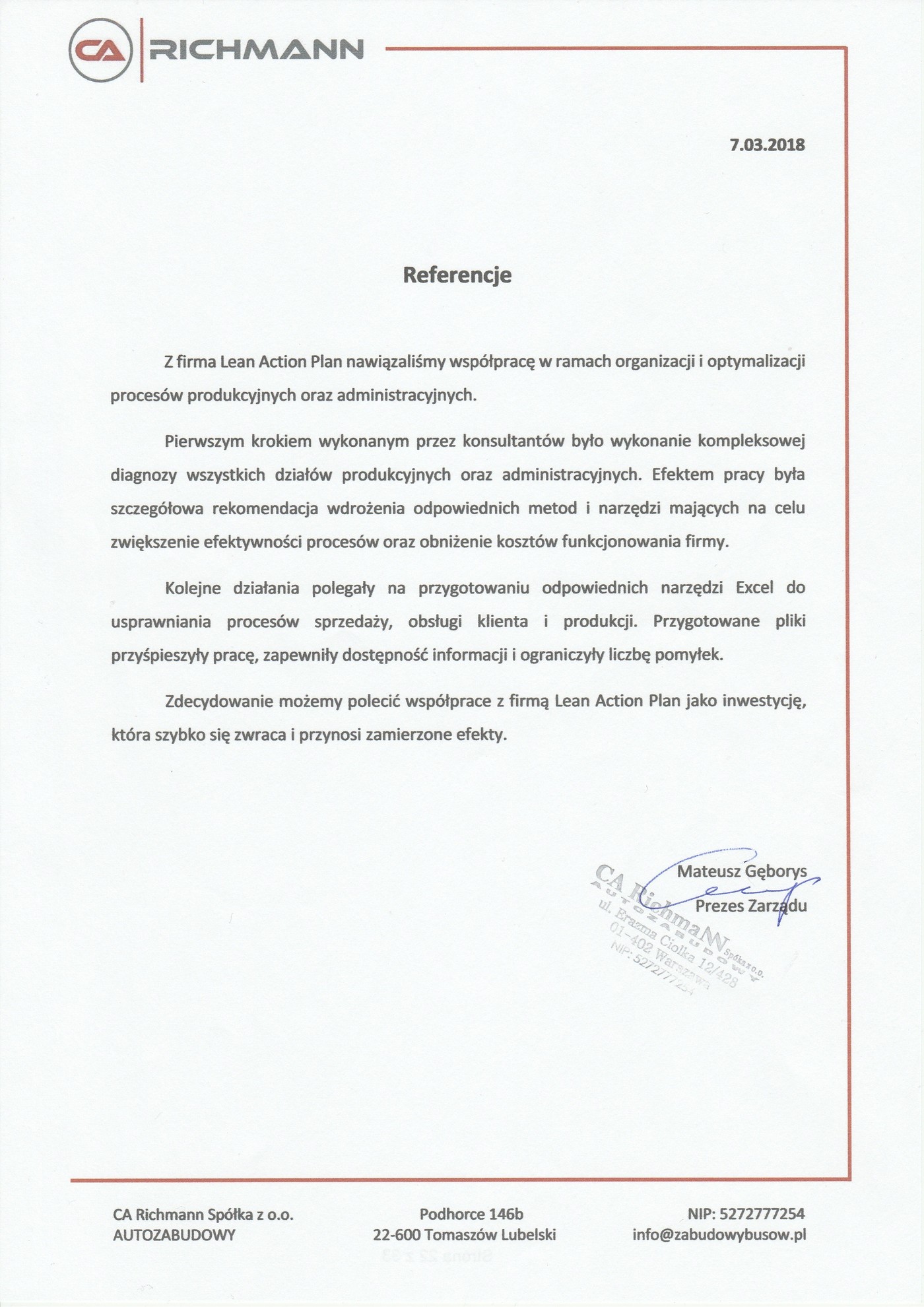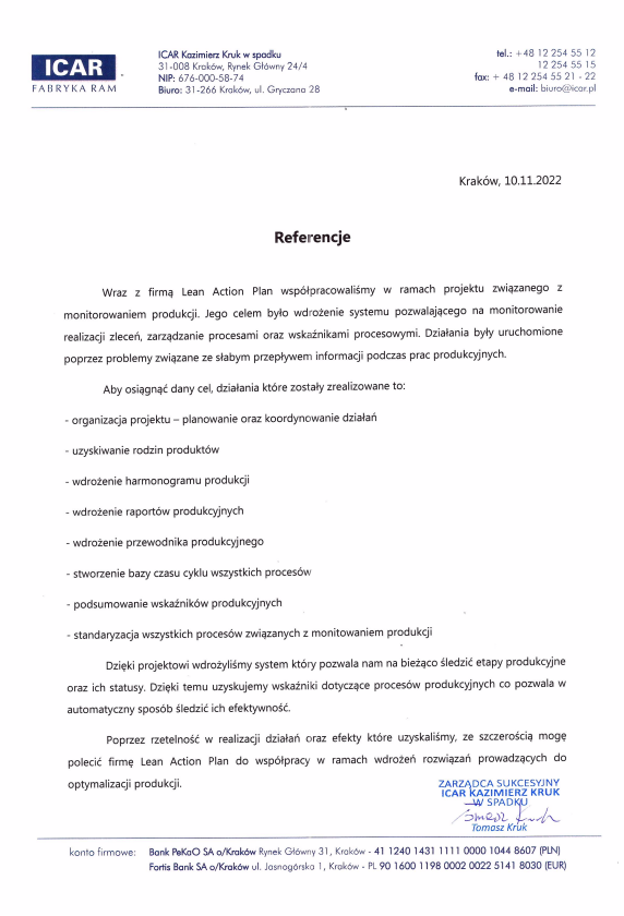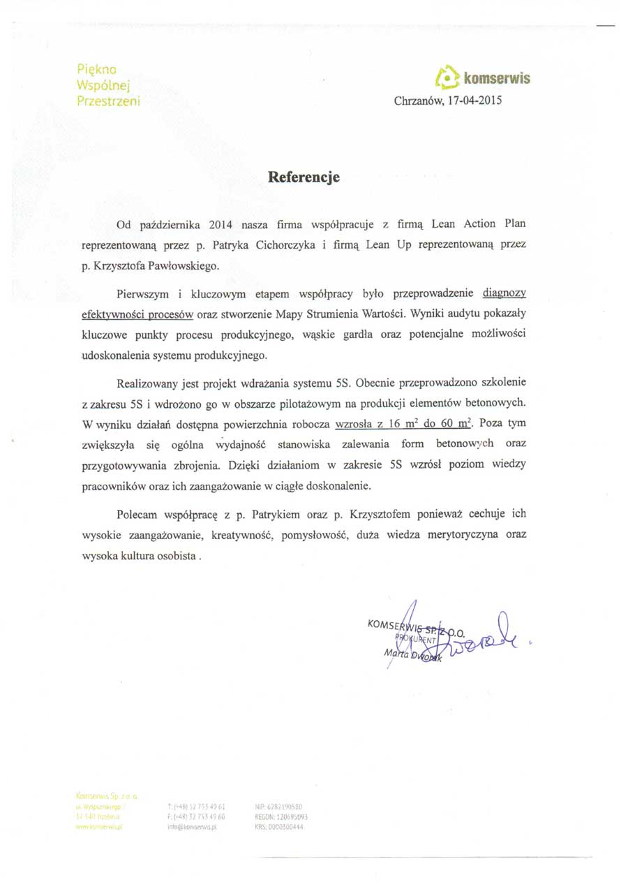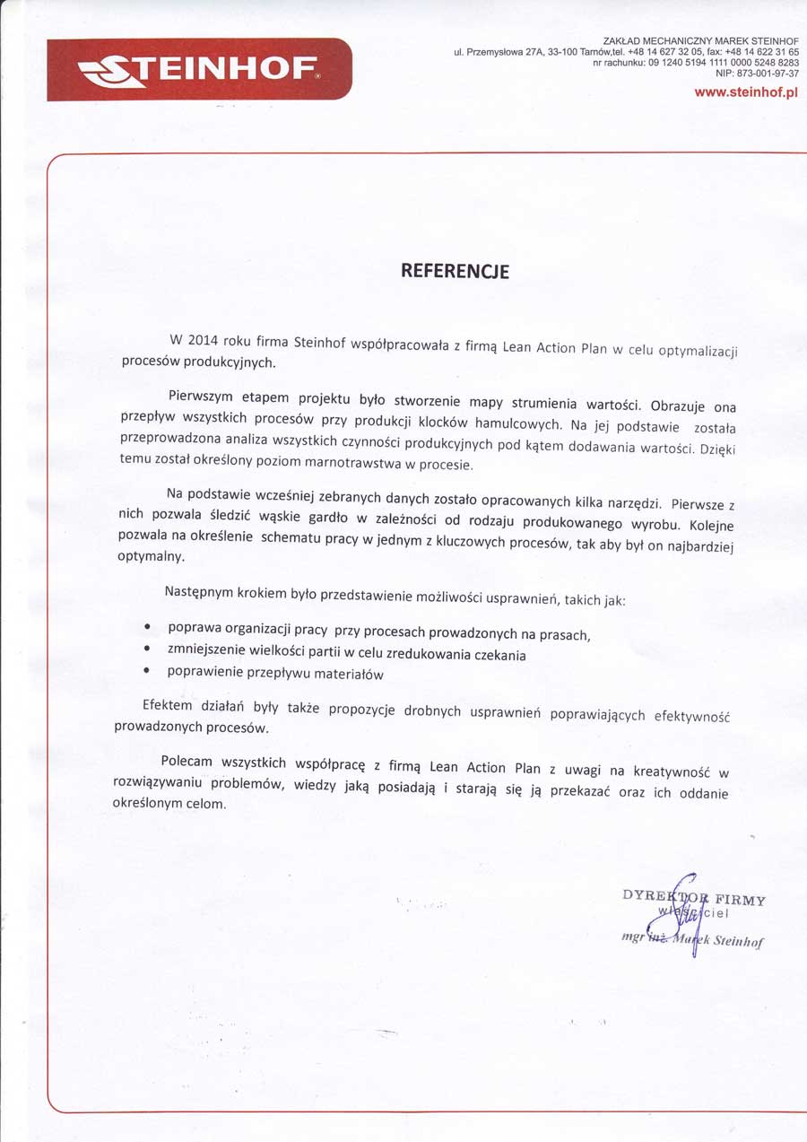 „Z całą pewnością możemy rekomendować firmę Lean Action Plan świadczącą usługi w zakresie optymalizacji i organizacji procesów produkcyjnych. Profesjonalni konsultanci z zapałem i dbałością o szczegóły analizują procesy, identyfikują potencjalne obszary usprawnień i wskazują możliwe sposoby doskonalenia bieżącego funkcjonowania przedsiębiorstwa.”