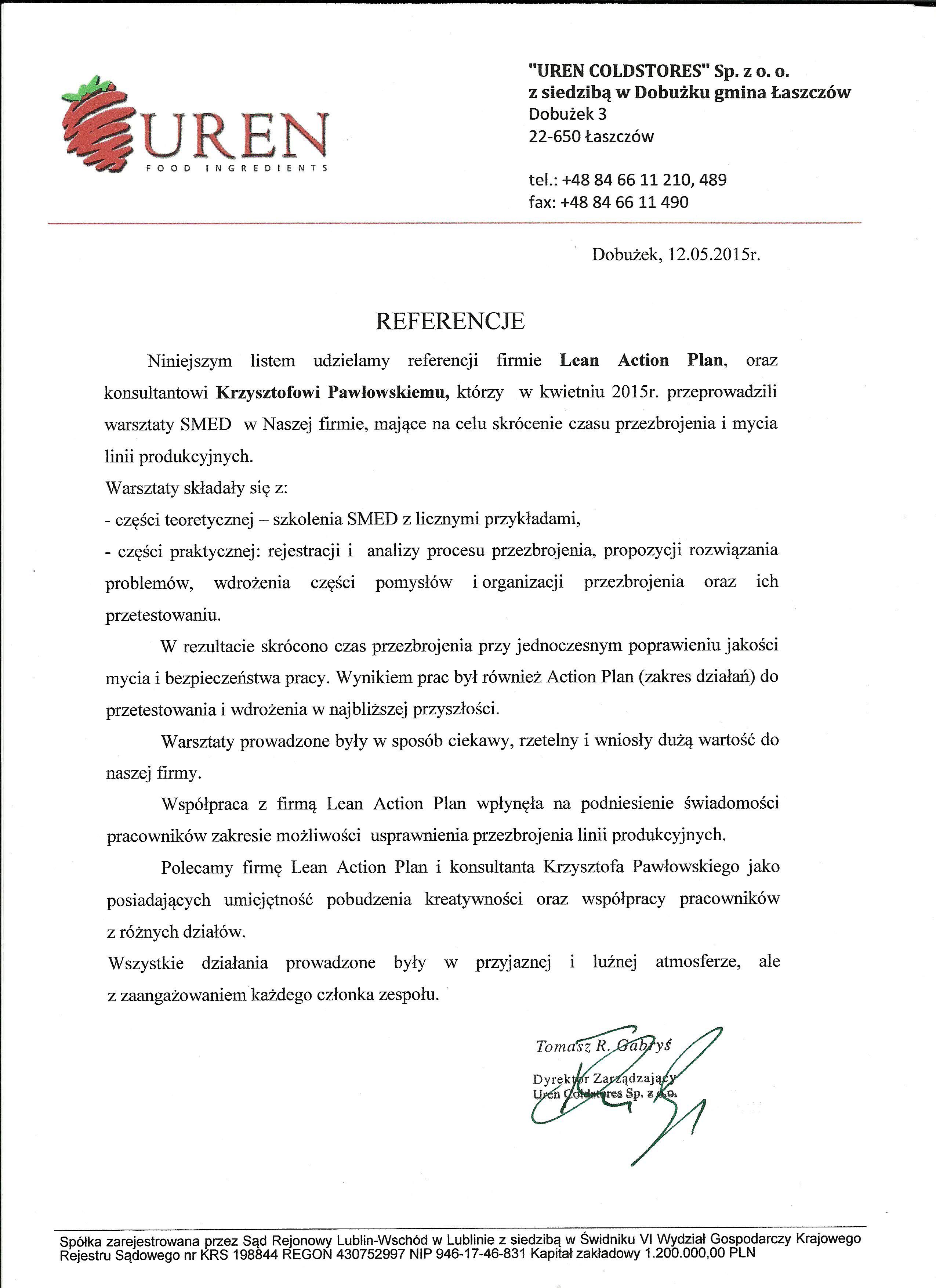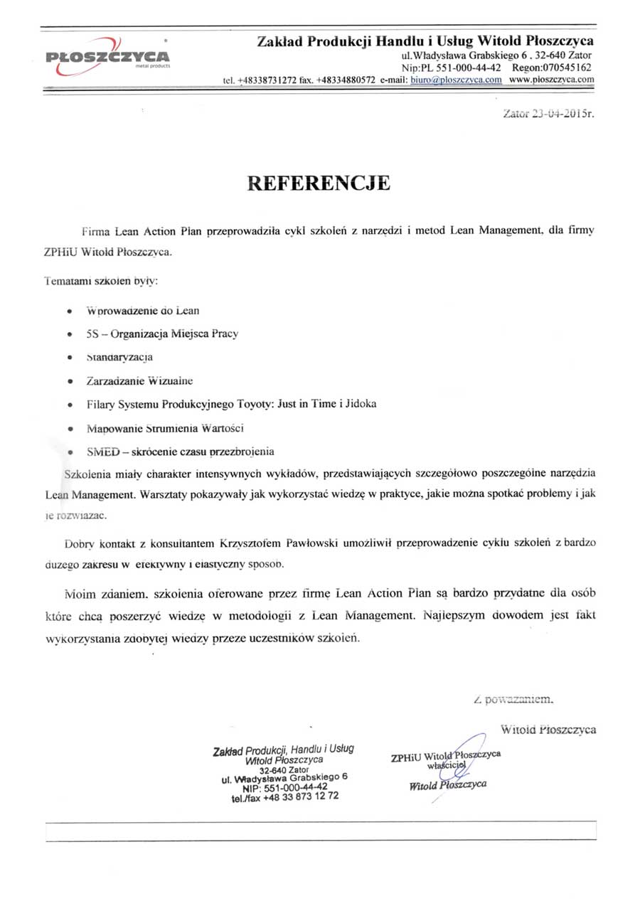 „Doświadczeni konsultanci firmy Lean Action Plan pomogli nam dojrzeć pełny obraz naszych procesów oraz trafnie sprecyzować działania w kierunku ich poprawy. Ich profesjonalizm i rzeczowość pozwala stwierdzić, że są stabilnymi oraz godnymi polecenia partnerami w rozwoju biznesu.”