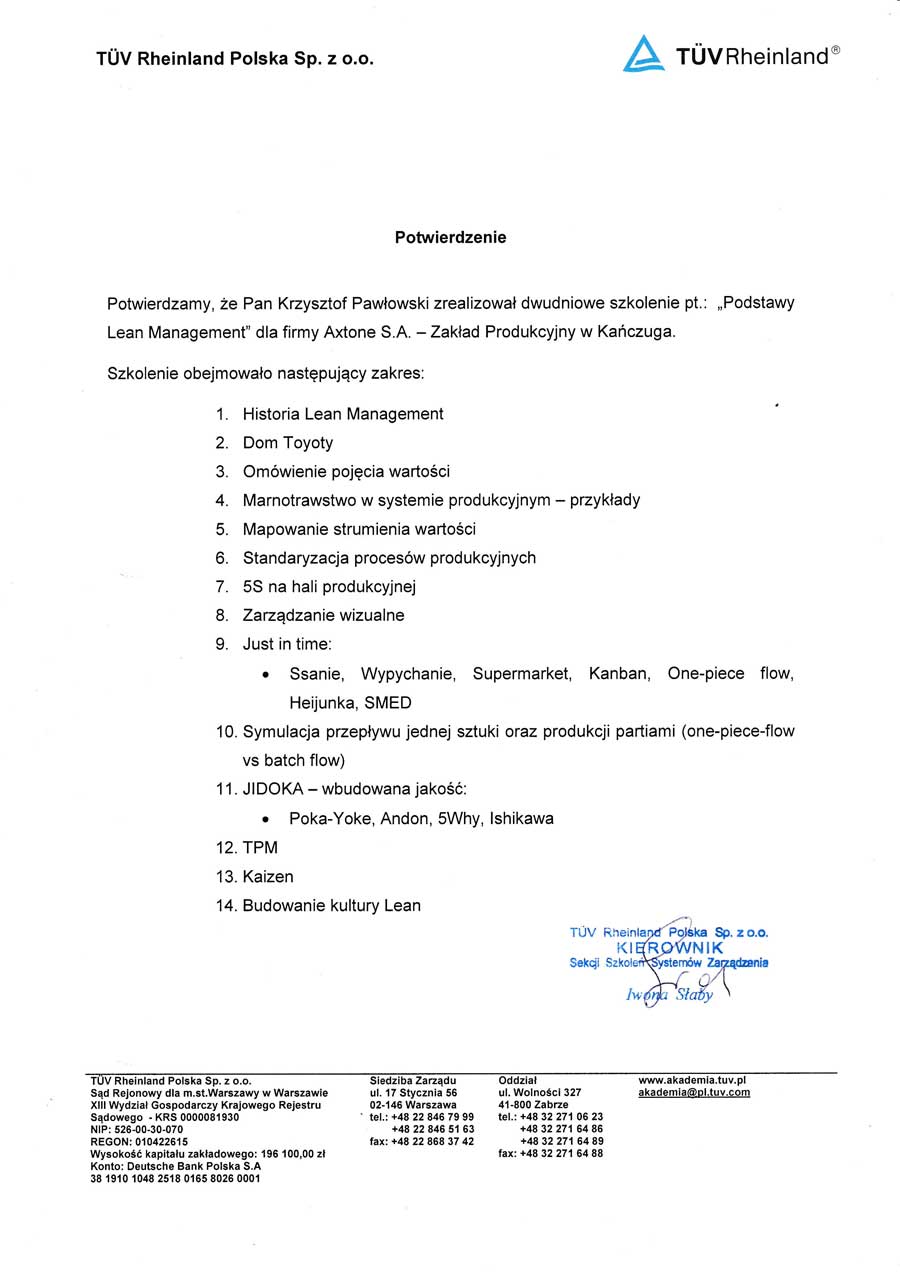 „Uważam wybór Lean Action Plan jako firmy szkoleniowej, wprowadzającej w świat Lean Management, za jak najbardziej trafiony. Bogate doświadczenie zdobyte we wcześniej przeprowadzonych wdrożeniach LM daje dodatkowe spojrzenie na różne obszary zastosowań już sprawdzonych metod. Polecam Lean Action Plan, jeśli myślicie Państwo o lepszej organizacji Waszej firmy.”