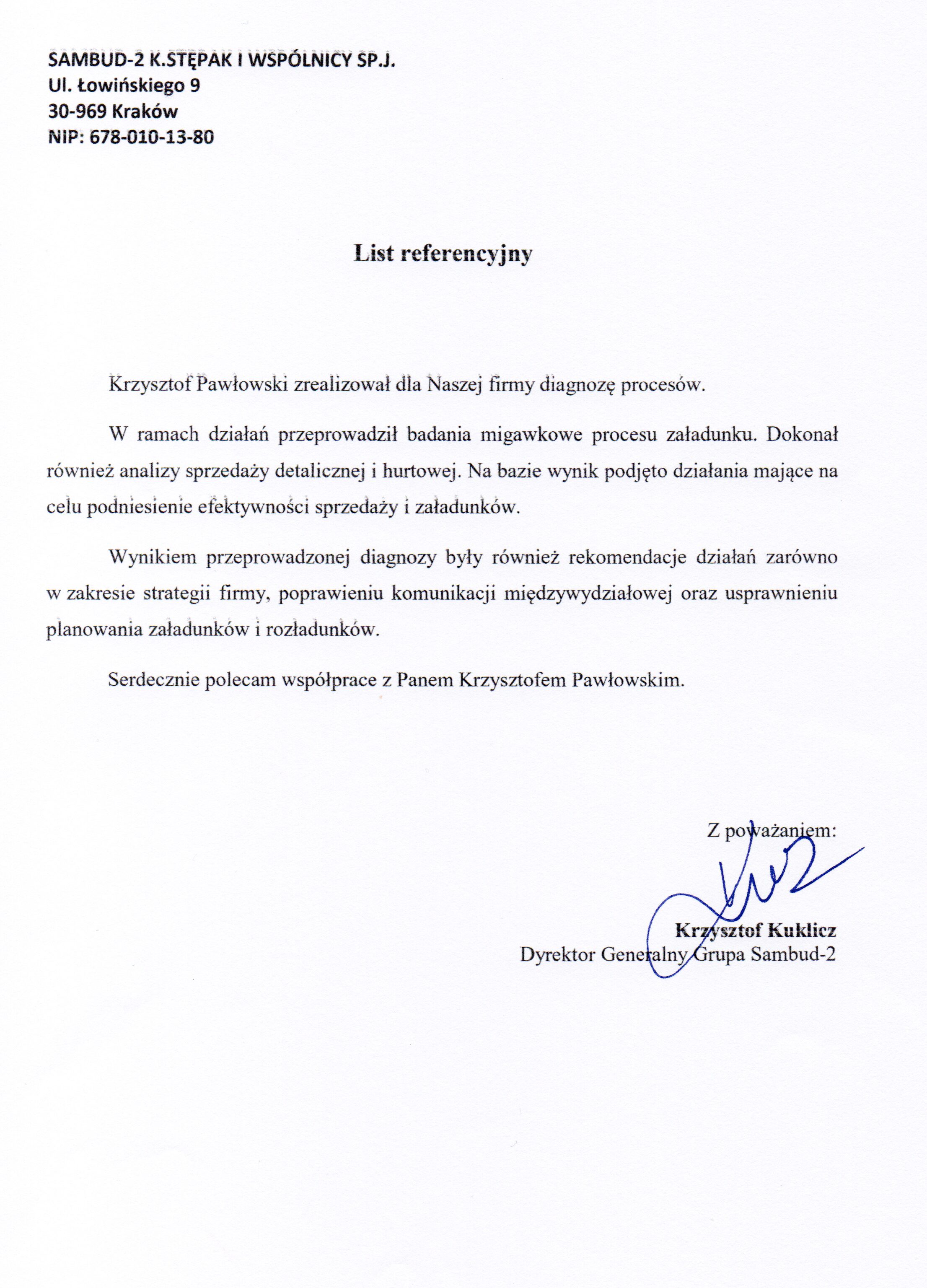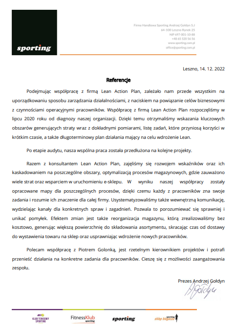 „Zdecydowaliśmy się na współpracę z Piotrem Golonką z firmy Lean Action Plan, który przeprowadził dla nas warsztaty mapowania procesów. Profesjonalizm, zrozumienie procesów oraz sprawna umiejętność przekazywania wiedzy dla wymagającego zespołu pozwala nam zarekomendować Lean Action Plan wszystkim, którzy chcą rozwijać swój biznes”.