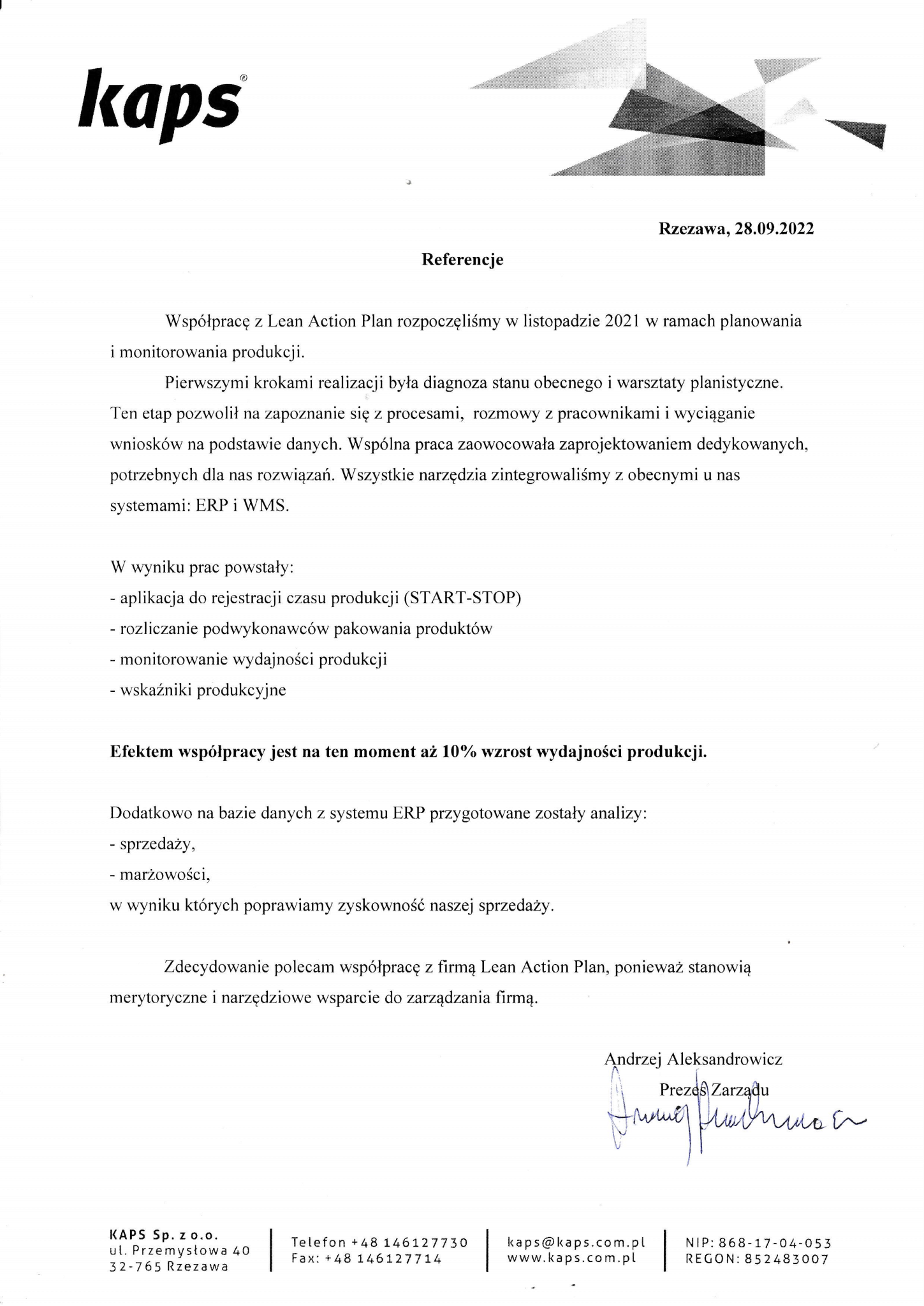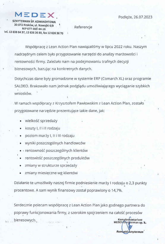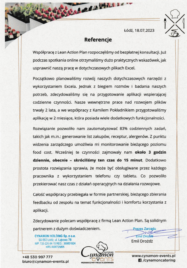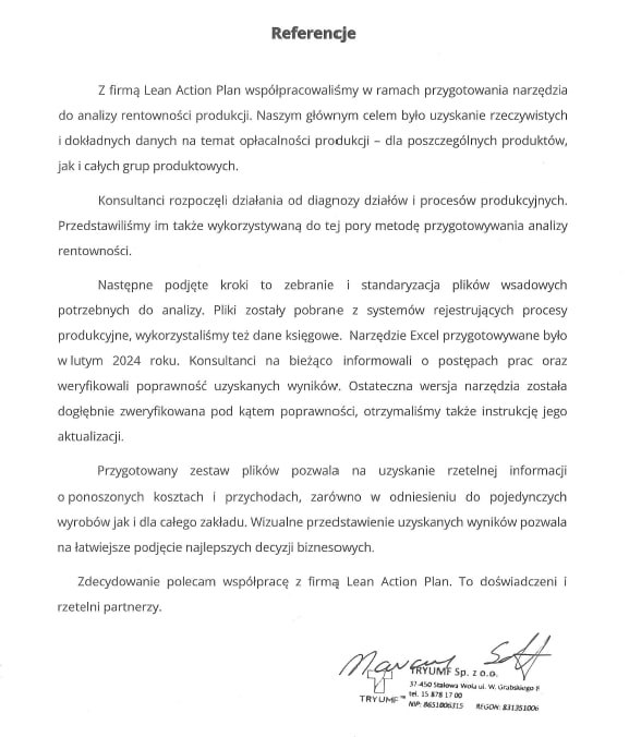 ,,Przygotowany zestaw plików pozwala na uzyskanie rzetelnej informacji o ponoszonych kosztach i przychodach, zarówno w odniesieniu do pojedynczych wyrobów jak i dla całego zakładu. […] Zdecydowanie polecam współpracę z firmą Lean Action Plan. To doświadczeni i rzetelni partnerzy.”