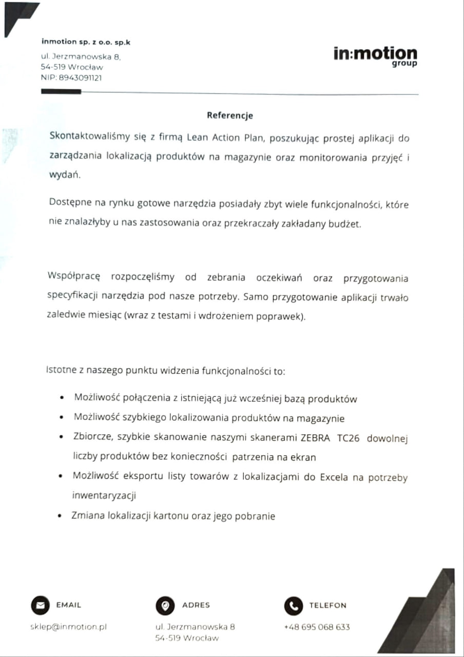 „Polecam firmę Lean Action Plan nie tylko ze względu na ich kompetencje w przygotowaniu aplikacji, ale także z uwagi na doświadczenie w zakresie projektowania optymalnego procesu przepływu informacji.”