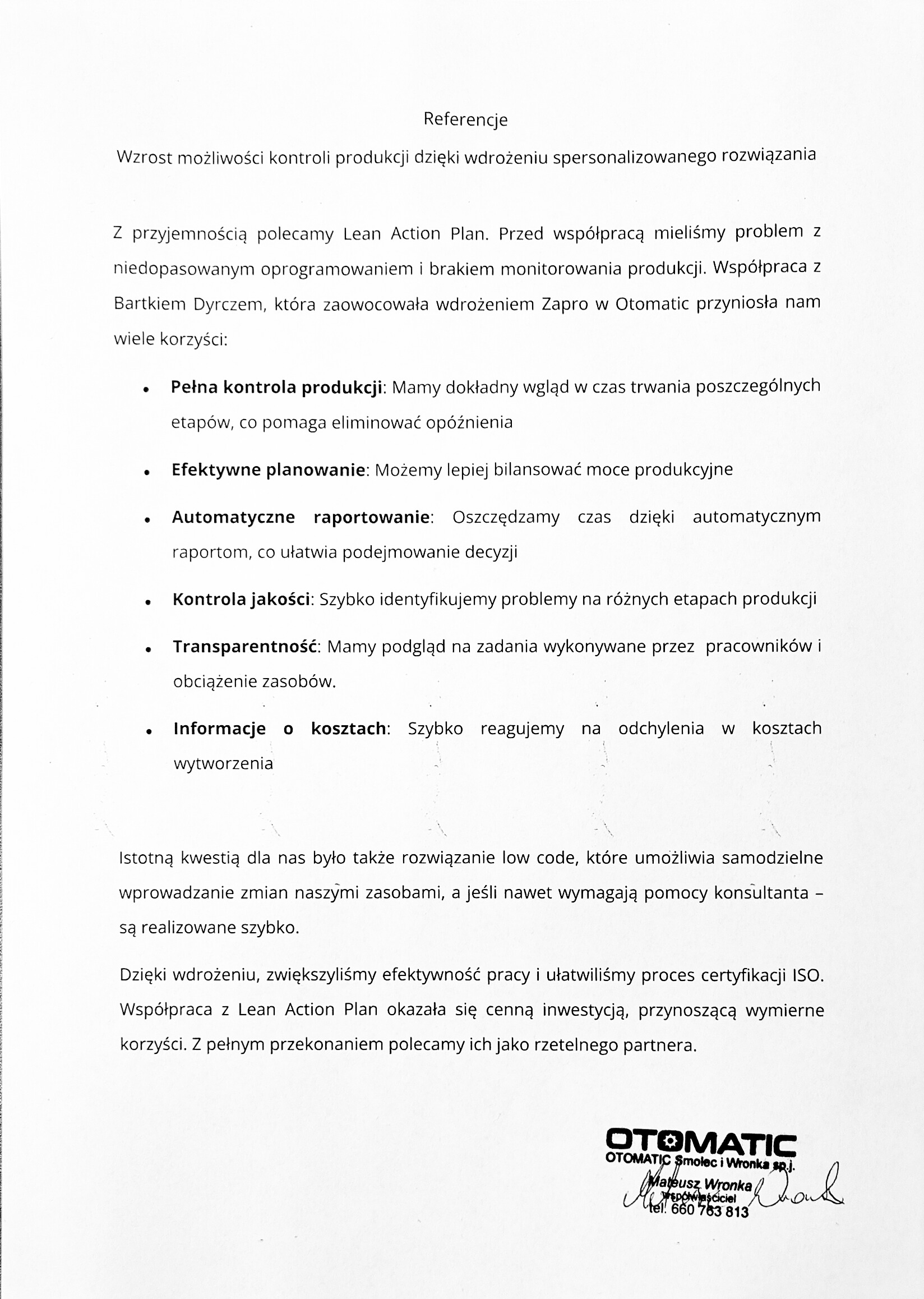 „Z przyjemnością polecamy Lean Action Plan. Przed współpracą mieliśmy problem z niedopasowanym oprogramowaniem i brakiem monitorowania produkcji. Współpraca z Bartkiem Dyrczem, która zaowocowała wdrożeniem Zapro w Otomatic, przyniosła nam wiele korzyści m.in. pełna kontrola produkcji […] Dzięki wdrożeniu zwiększyliśmy efektywność pracy i ułatwiliśmy proces certyfikacji ISO.”