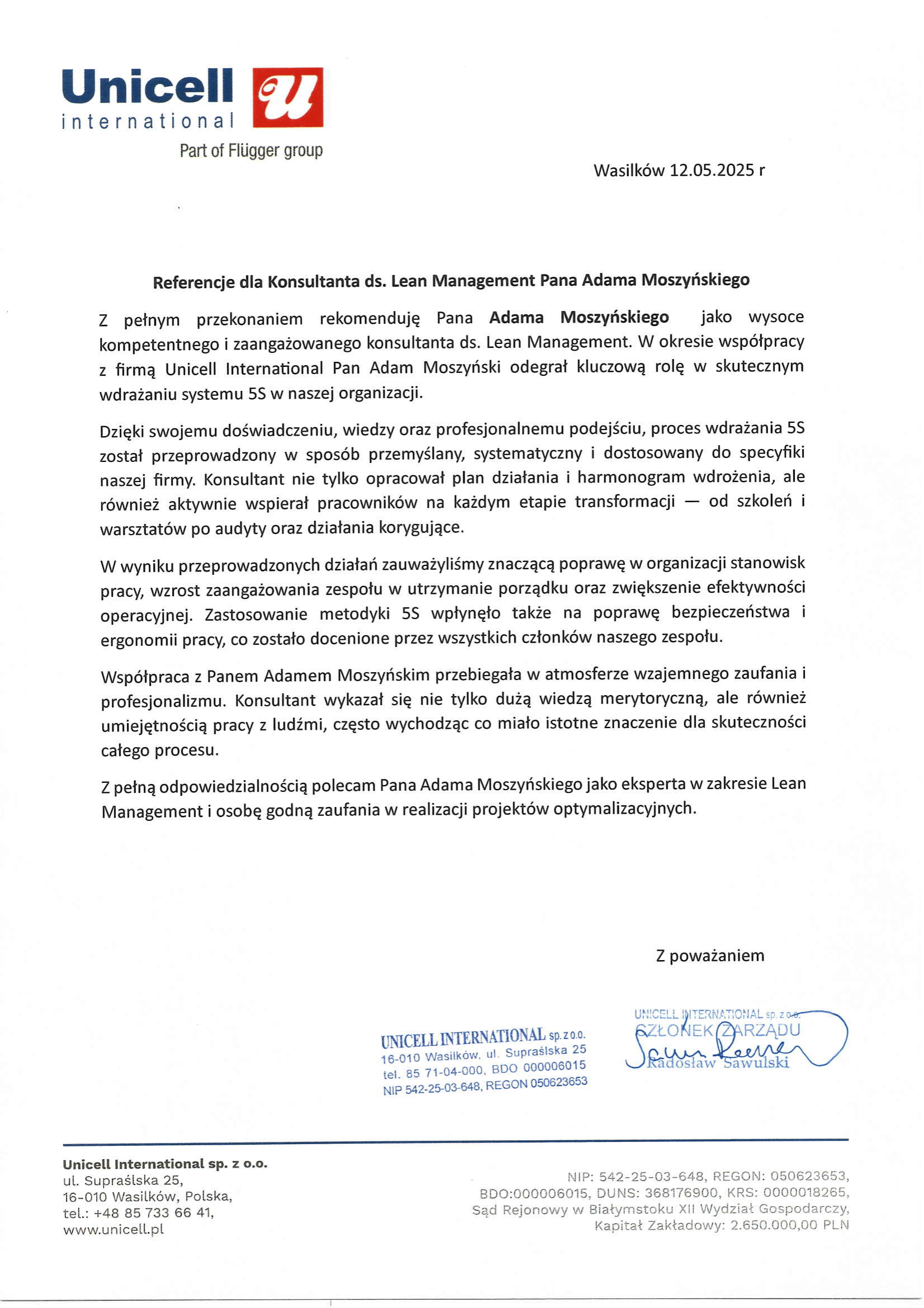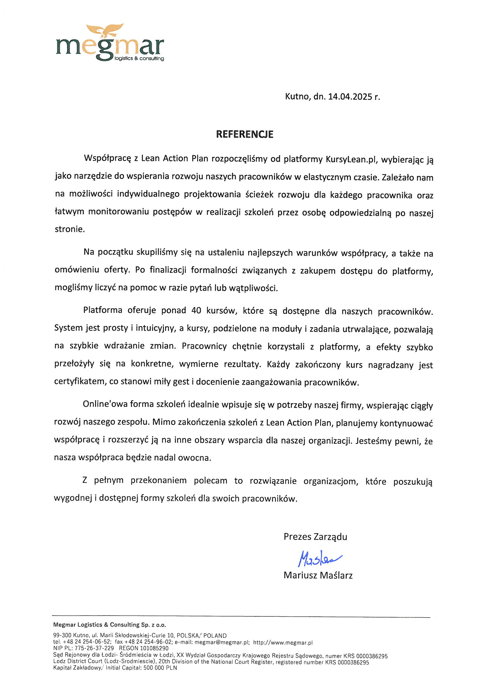 „Z pełnym przekonaniem polecam firmę Lean Action Plan jako solidnego i kompetentnego partnera w zakresie doradztwa lean. Ich profesjonalizm, zaangażowanie i praktyczne podejście przyniosły nam wymierne korzyści i pomogły nam osiągnąć znaczący postęp w różnych obszarach naszej działalności.”