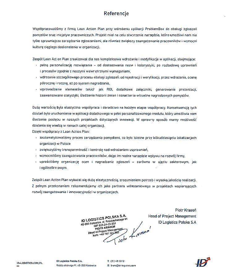 „Współpracowaliśmy z firmą Lean Action Plan przy wdrożeniu aplikacji ProblemBox do obsługi zgłoszeń pomysłów oraz inicjatyw pracowniczych.” […] „Zespół Lean Action Plan wykazał się dużą elastycznością, zrozumieniem potrzeb i wysoką jakością realizacji. Z pełnym przekonaniem rekomendujemy ich jako partnera wdrożeniowego w projektach wspierających rozwój zaangażowania i innowacyjności w organizacjach.”