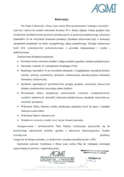 „Jako klient firmy Lean Action Plan jesteśmy zadowoleni ze współpracy z Panem Patrykiem Cichorczykiem. Wykazał się wysokim profesjonalizmem, umiejętnością pracy z ludźmi, zdolnościami analitycznymi oraz klarowanym sposobem przekazywania wiedzy.”