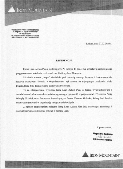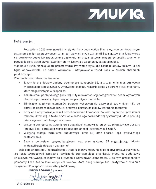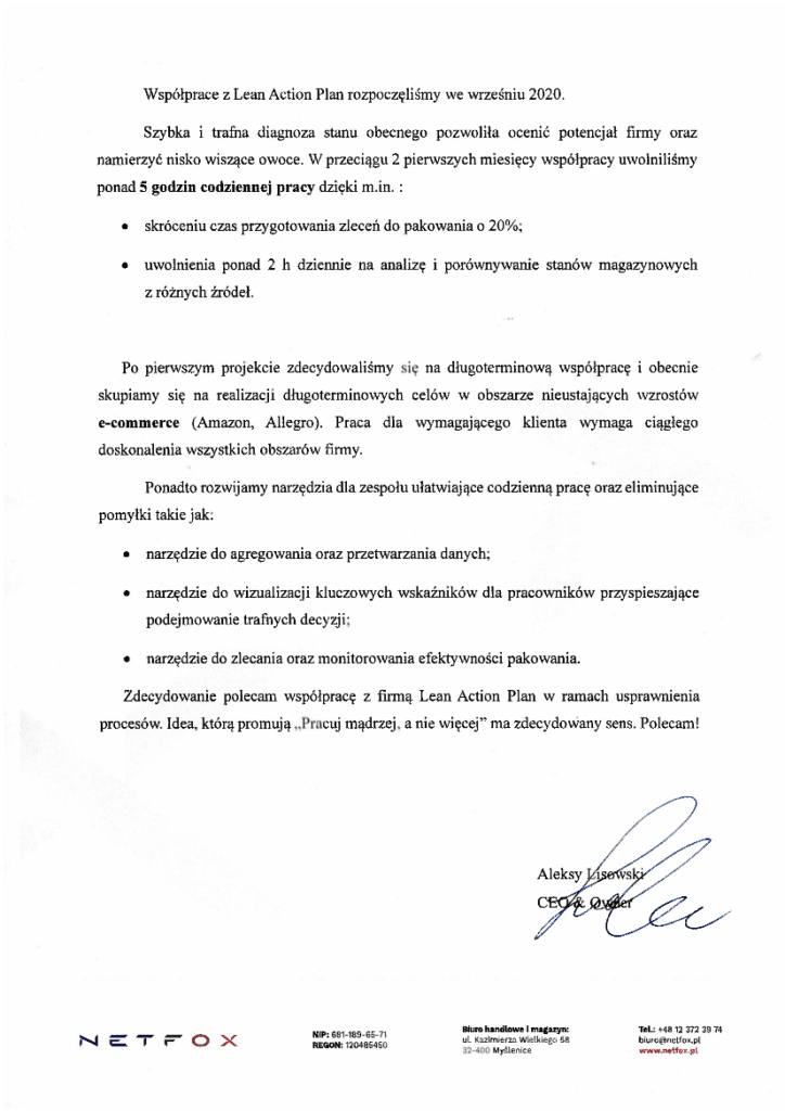 „Usługa została wykonana solidnie, a profesjonalne i elastyczne podejście firmy Lean Action Plan pozwoliło na realizację wszystkich etapów umowy w określonym terminie”.