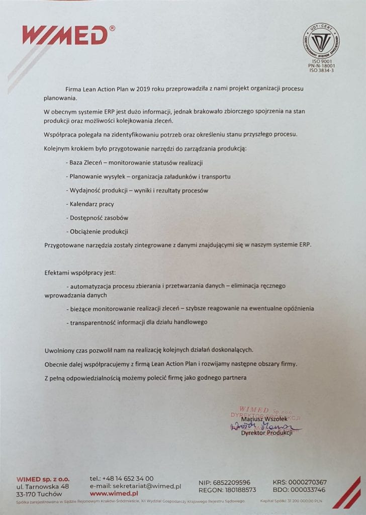 ,,Przygotowany zestaw plików pozwala na uzyskanie rzetelnej informacji o ponoszonych kosztach i przychodach, zarówno w odniesieniu do pojedynczych wyrobów jak i dla całego zakładu. […] Zdecydowanie polecam współpracę z firmą Lean Action Plan. To doświadczeni i rzetelni partnerzy.”