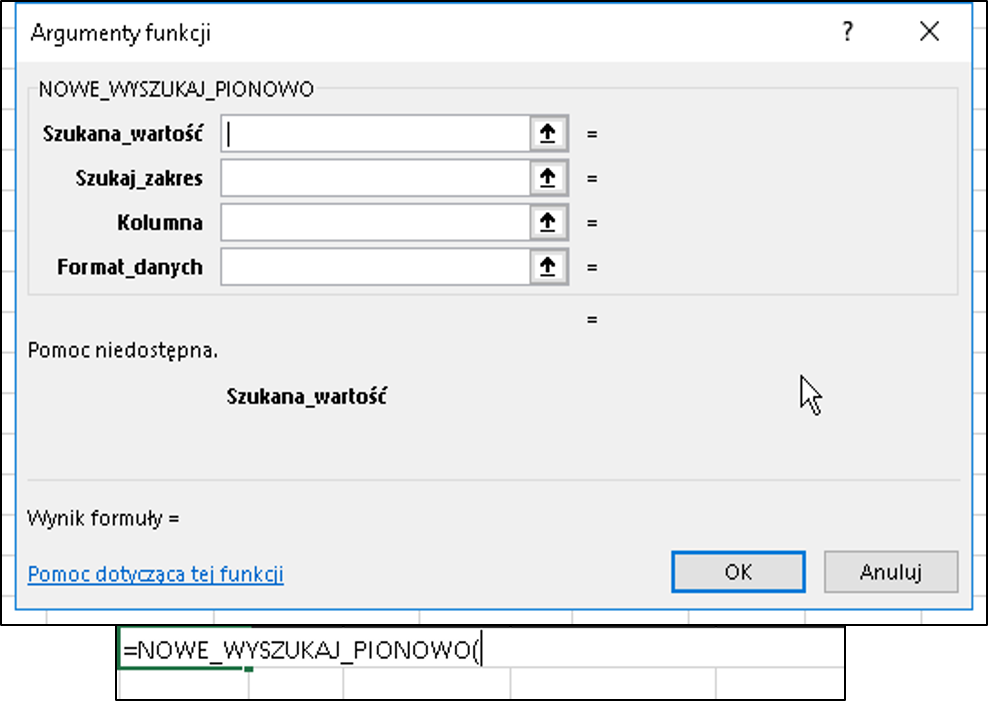 Jak widzisz, w oknie edycji funkcji nie ma żadnych podpowiedzi. Tak samo, próżno szukać paska argumentów przy wpisywaniu funkcji.
