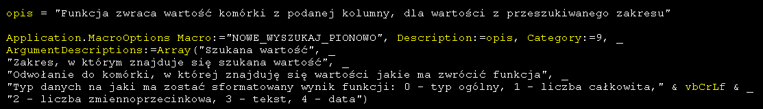 Aby to zrobić, musisz wykorzystać instrukcję Application.MacroOptions. Funkcja ta ma na celu właśnie uzupełnienie okna edycji funkcji o niezbędne teksty pomocy.