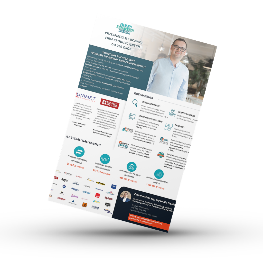 Jako specjalista w zakresie organizacji i optymalizacji procesów w firmach, na co dzień przyśpiesza ich rozwój. Z jednej strony zmniejsza koszty, zwiększa efektywność procesów i odzyskuje czas, a z drugiej strony prowadzi do wzrostu zaangażowania pracowników. Jego misją jest dzielenie się wiedzą i doświadczeniem, dlatego tworzy kursy i prowadzi spotkania na żywo oraz pisze artykuły. Z powodzeniem realizuje projekty w różnych branżach (przetwórstwa metali, tworzyw sztucznych, okiennej i poligraficznej) i obszarach (produkcja, sprzedaż).